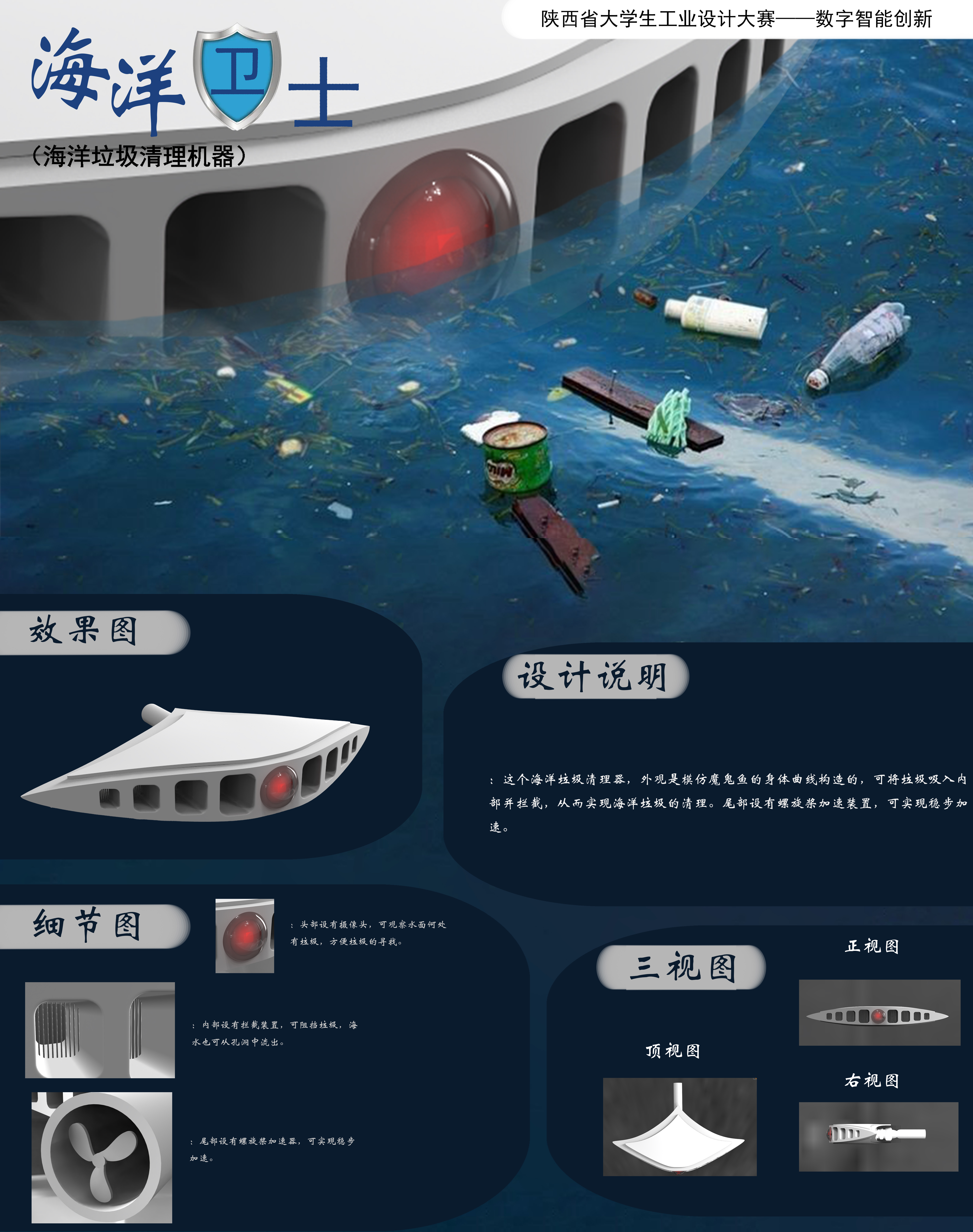 这个海洋垃圾清理器,外观是模仿魔鬼鱼的身体曲线构造的,可将垃圾吸入内部并拦截,从而实现海洋垃圾的清理。尾部设有螺旋桨加速装置,可实现稳步加速。