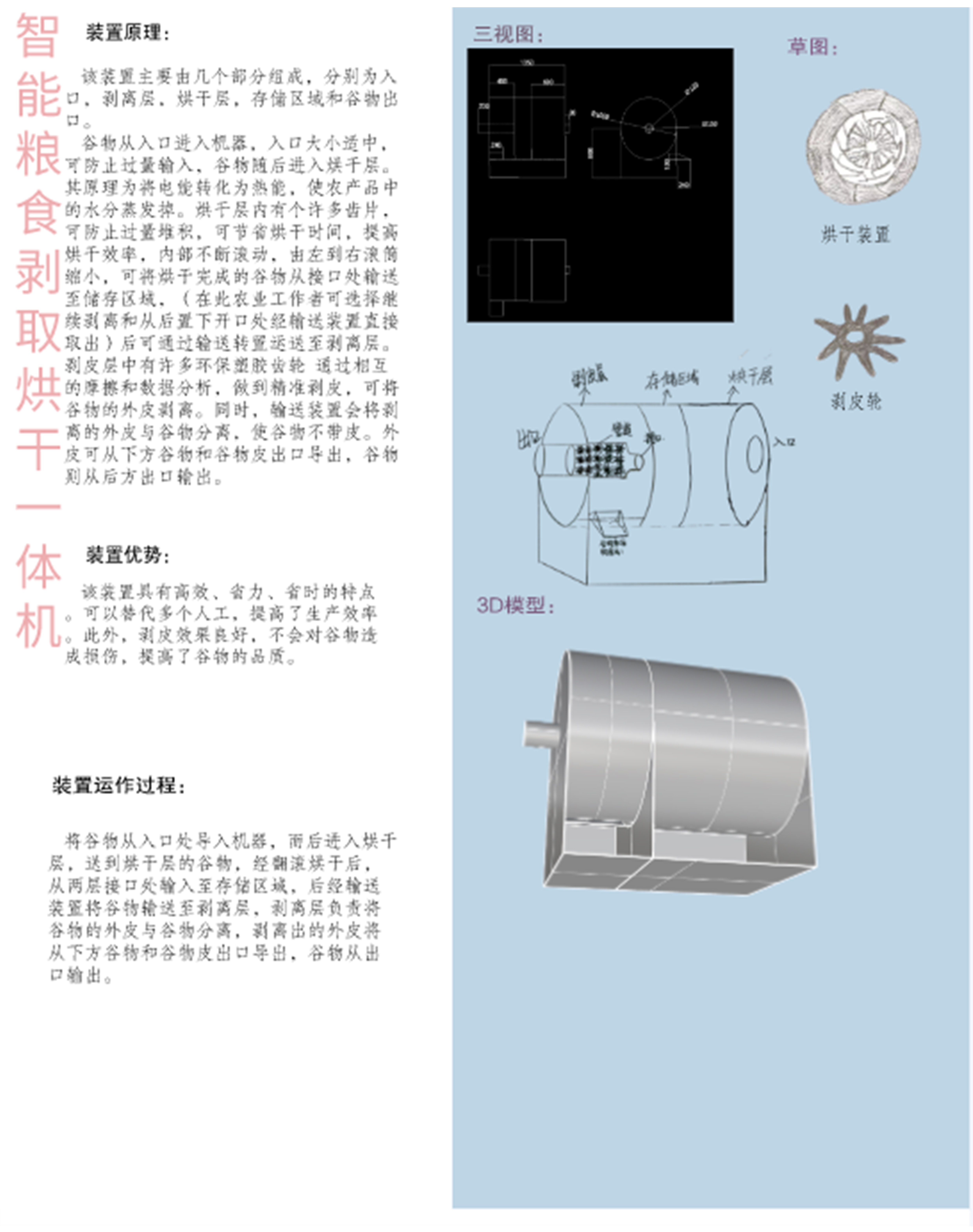 该作品是根据今年连续大雨,导致无法晾晒,甚至有些谷物因淋雨而导致迅速霉变,需紧急烘干。今年河南小麦遇到的烂场雨事件,也体现了谷物烘干的重要性,所以我们设计了智能谷物剥取烘干一体机。该装置为中小型装置,可供给农业工作者使用。该产品主要分为三个部分,剥离层,存储区域和烘干层。烘干层内有多个齿片,可防止过量堆积,可节省烘干时间,提高烘干效率。剥离层内有许多环保塑胶齿轮,通过相互摩擦,将谷物脱皮。