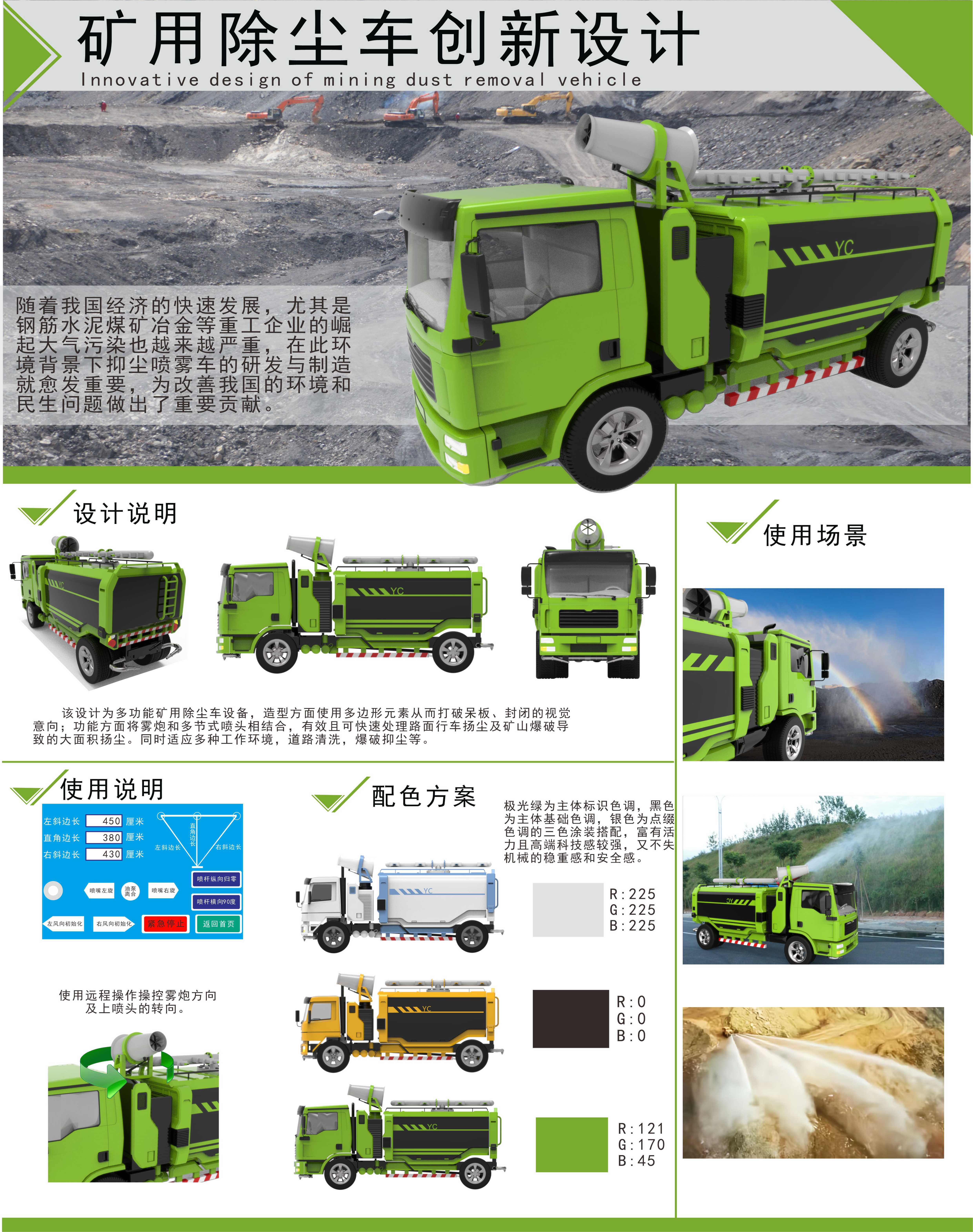 该设计为多功能矿用除尘车设备,造型方面使用多边形元素从而打破呆板、封闭的视觉意向;功能方面将雾炮和多节式喷头相结合,有效且可快速处理路面行车扬尘及矿山爆破导致的大面积扬尘。同时适应多种工作环境,道路清洗,爆破抑尘等。