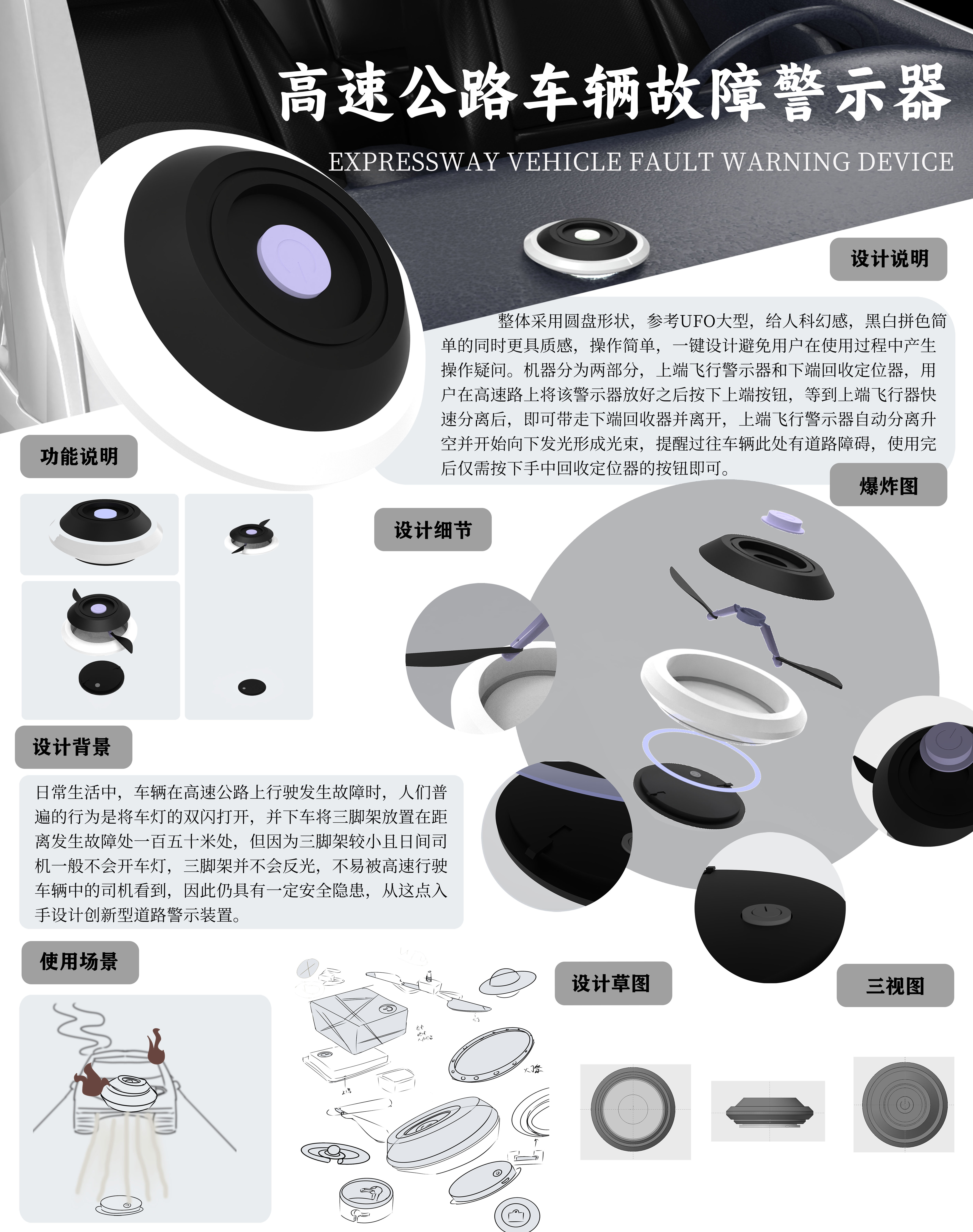 车辆在高速公路上行驶发生故障时,用户可将该警示器放置在距离发生故障处一百五十米处,警示器分为两部分,上端飞行警示器和下端回收定位器,放置好之后按下上端按钮,等到上端飞行器快速分离后,即可带走下端回收器并离开,上端飞行警示器自动分离升空并开始向下发光形成光束,提醒过往车辆此处有道路障碍,使用完后仅需按下手中回收定位器的按钮即可。