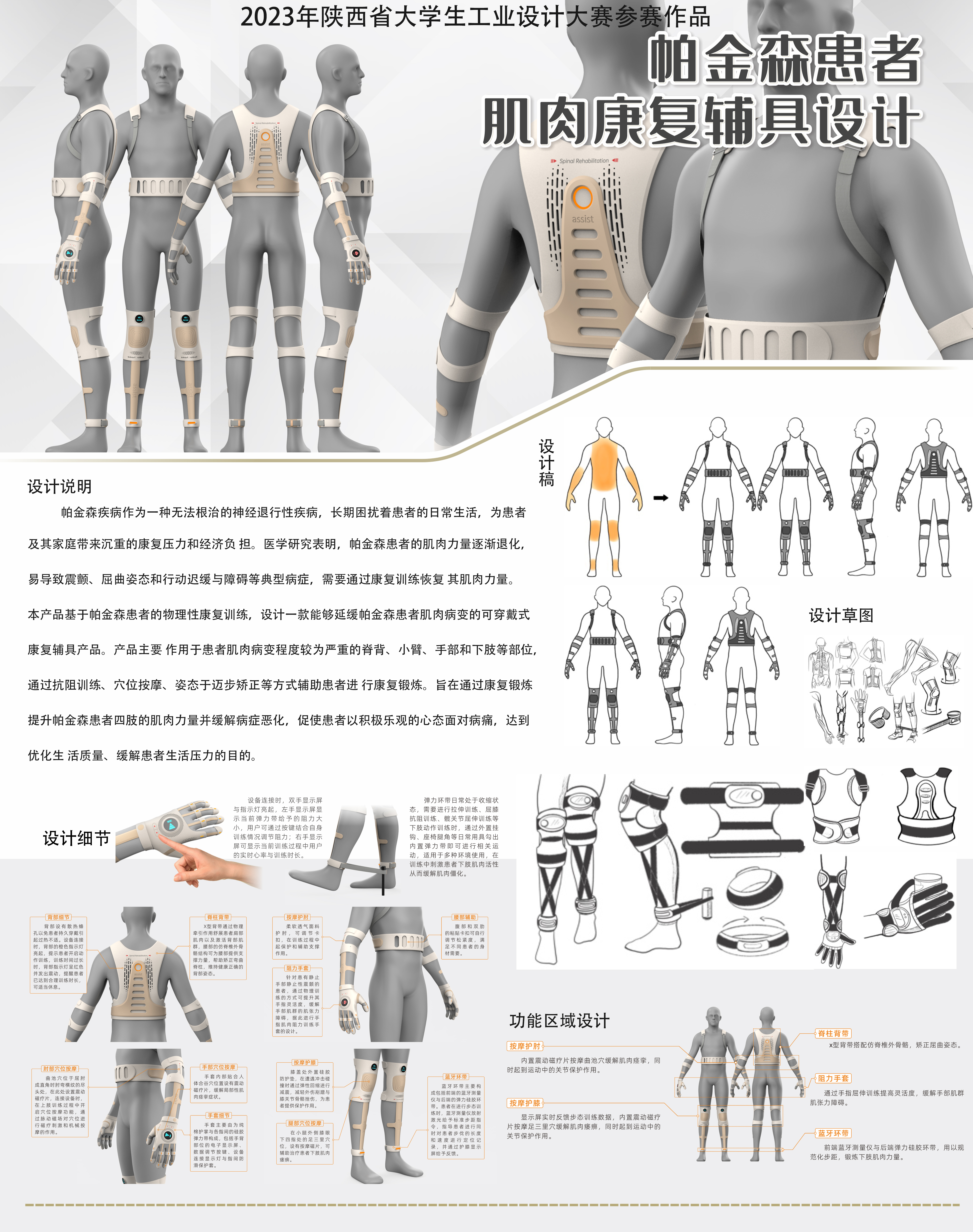 帕金森疾病作为一种无法根治的神经退行性疾病,长期困扰着患者的日常生活,为患者及其家庭带来沉重的康复压力和经济负 担。医学研究表明,帕金森患者的肌肉力量逐渐退化,易导致震颤、屈曲姿态和行动迟缓与障碍等典型病症,需要通过康复训练恢复 其肌肉力量。本产品基于帕金森患者的物理性康复训练,设计一款能够延缓帕金森患者肌肉病变的可穿戴式康复辅具产品。