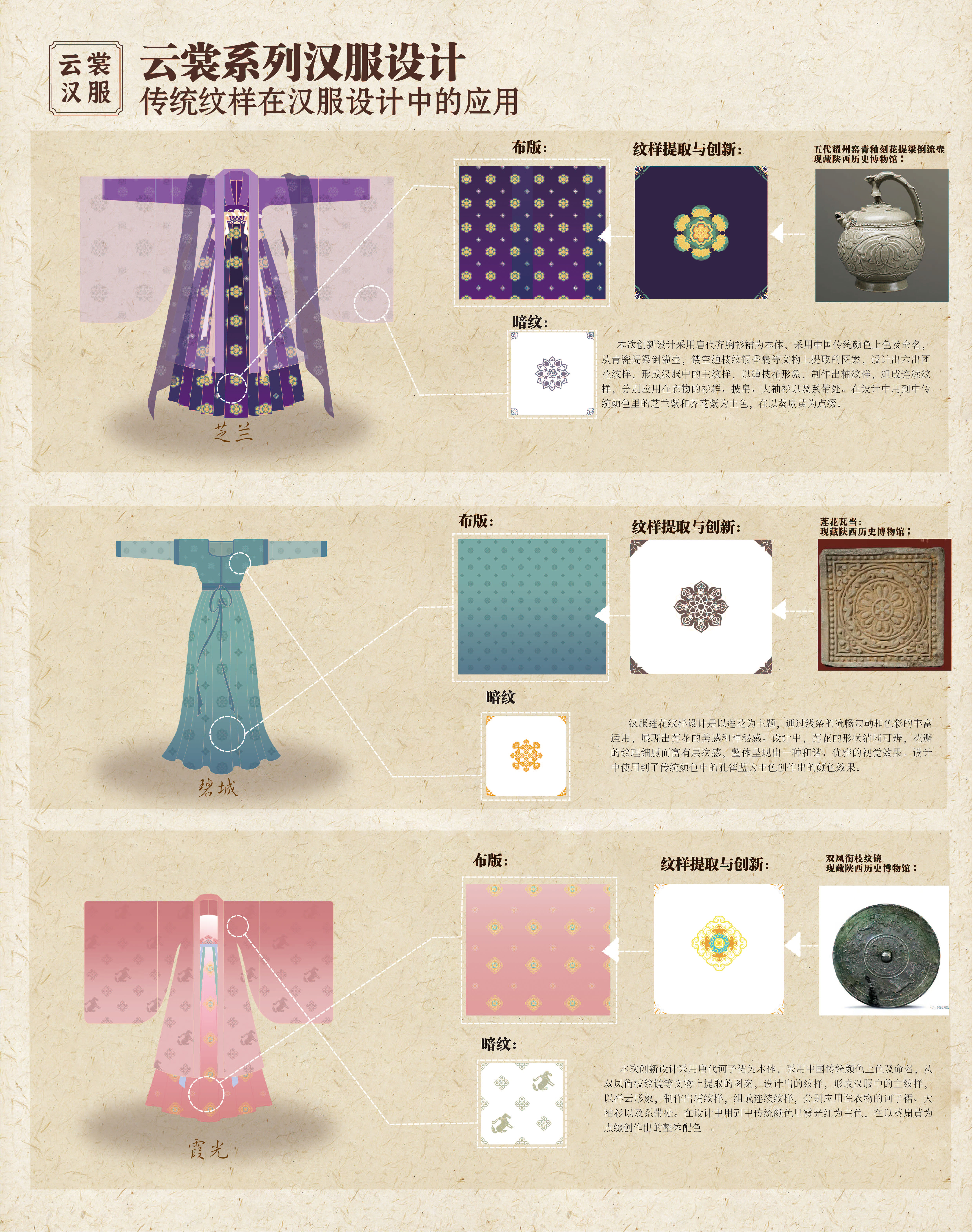 本次创新设计采用唐代汉服为本体,运用中国传统颜色上色及命名。从各种文物上提取的图案,设计出各种纹样,形成汉服中的主纹样及辅纹样、组成连续纹样、分别应用在衣物的各处。