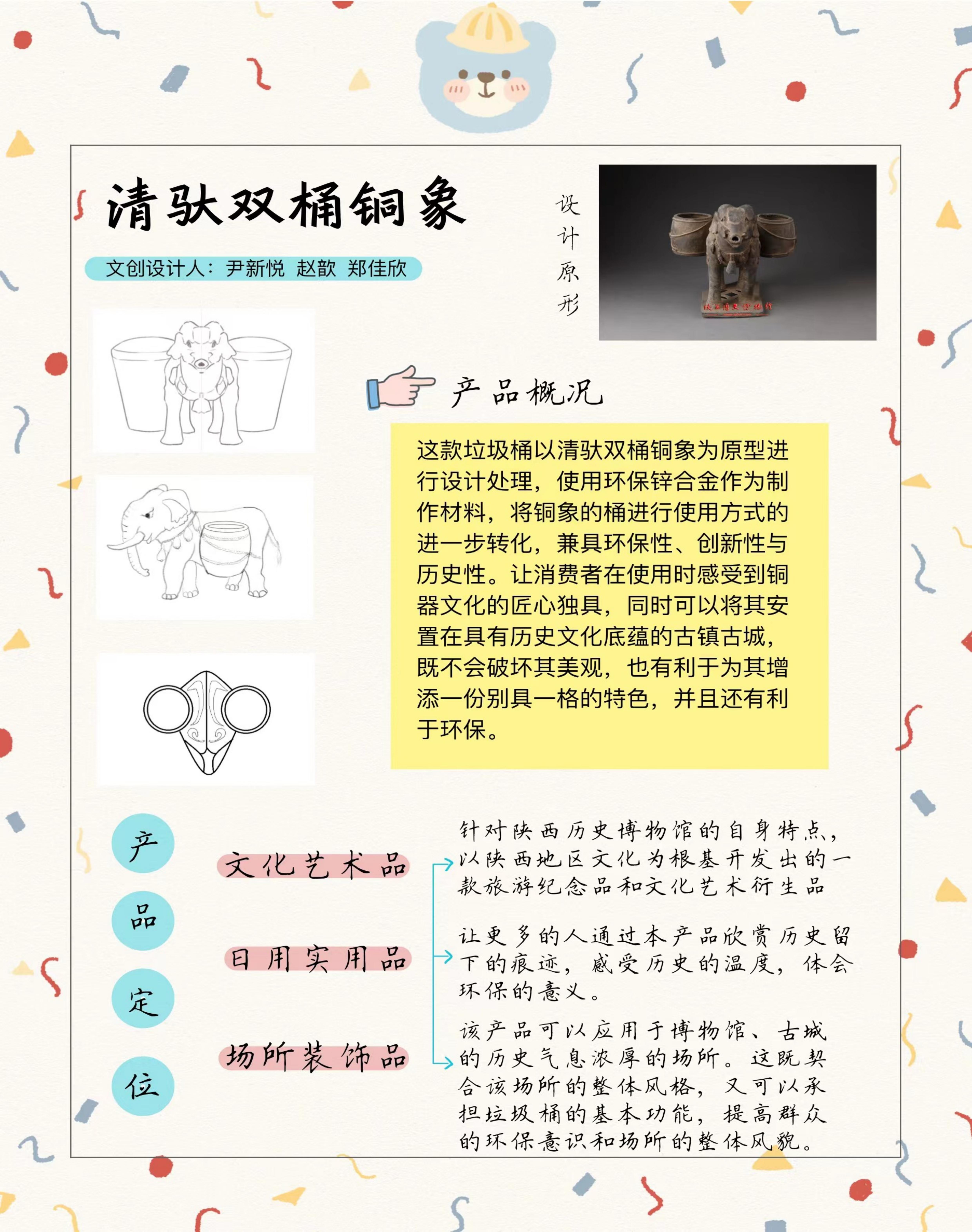 这款垃圾桶以清驮双桶铜象为原型进行设计处理,使用环保锌合金作为制作材料,将铜象的桶进行使用方式的进一步转化,兼具环保性、创新性与历史性。让消费者在使用时感受到铜器文化的匠心独具,同时可以将其安置在具有历史文化底蕴的古镇古城,既不会破坏其美观,也有利于为其增添一份别具一格的特色,并且还有利于环保。