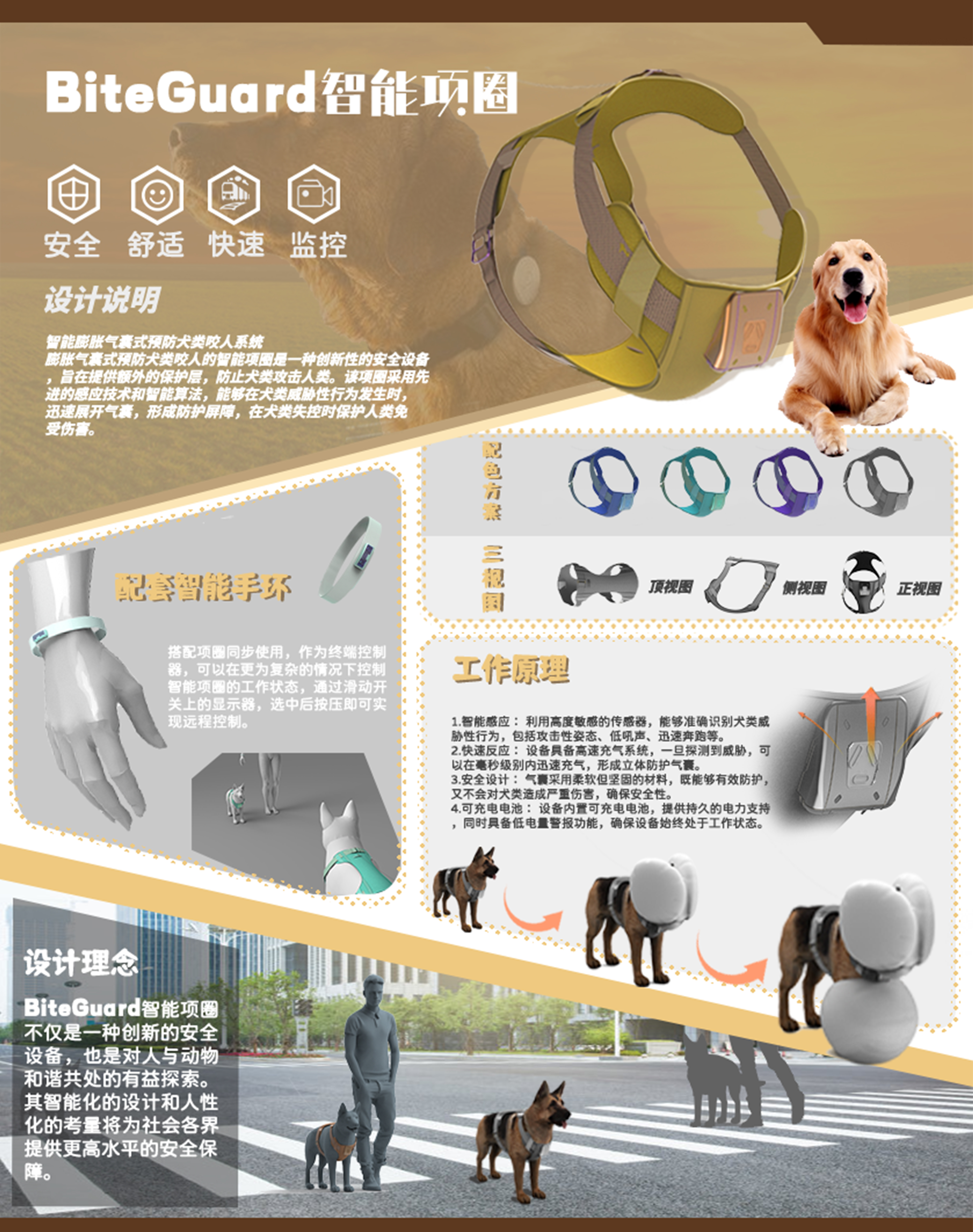 Bite Guard智能项圈是一款为人们提供额外保护的创新安全设备。它基于先进的感应技术,能够检测犬类威胁行为,并迅速充气形成安全气囊,减少人类受伤的风险。配备高敏感传感器,能准确识别犬类威胁行为,充气系统在毫秒内快速响应,迅速形成保护屏障。气囊采用柔软坚固的材料。内置电池提供持久电力。可通过配套智能手环监控、充电、解除充气。设计遵循动物保护和人道主义原则,保护人类安全的同时尽量减少对犬类伤害。