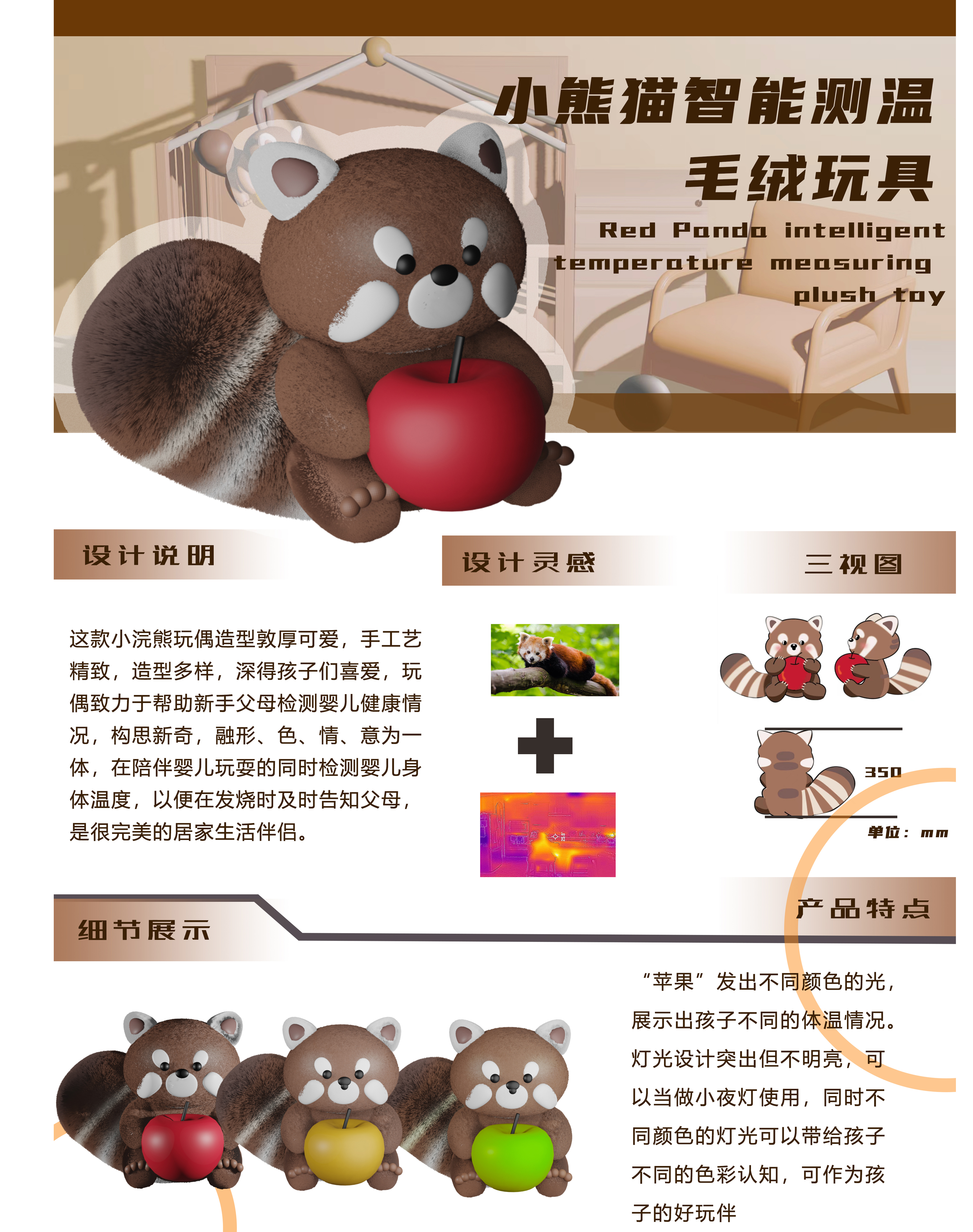 智能红外线测温小熊猫形态毛绒玩具将结合可爱的小熊猫外观和红外线测温技术,毛绒玩具外观以小熊猫为原型,呈现可爱的外观设计,吸引孩子的注意力。内置红外线测温仪,,直观地显示测温结果,温度测量范围广。安全性优先,符合相关安全标准。玩具还可提供温度报警功能,当温度超过预设范围时,会发出提醒音。同时,玩具具备互动功能,增强与孩子的互动性。这款智能红外线测温小熊猫毛绒玩具既作为测温工具,又能带来乐趣和陪伴。