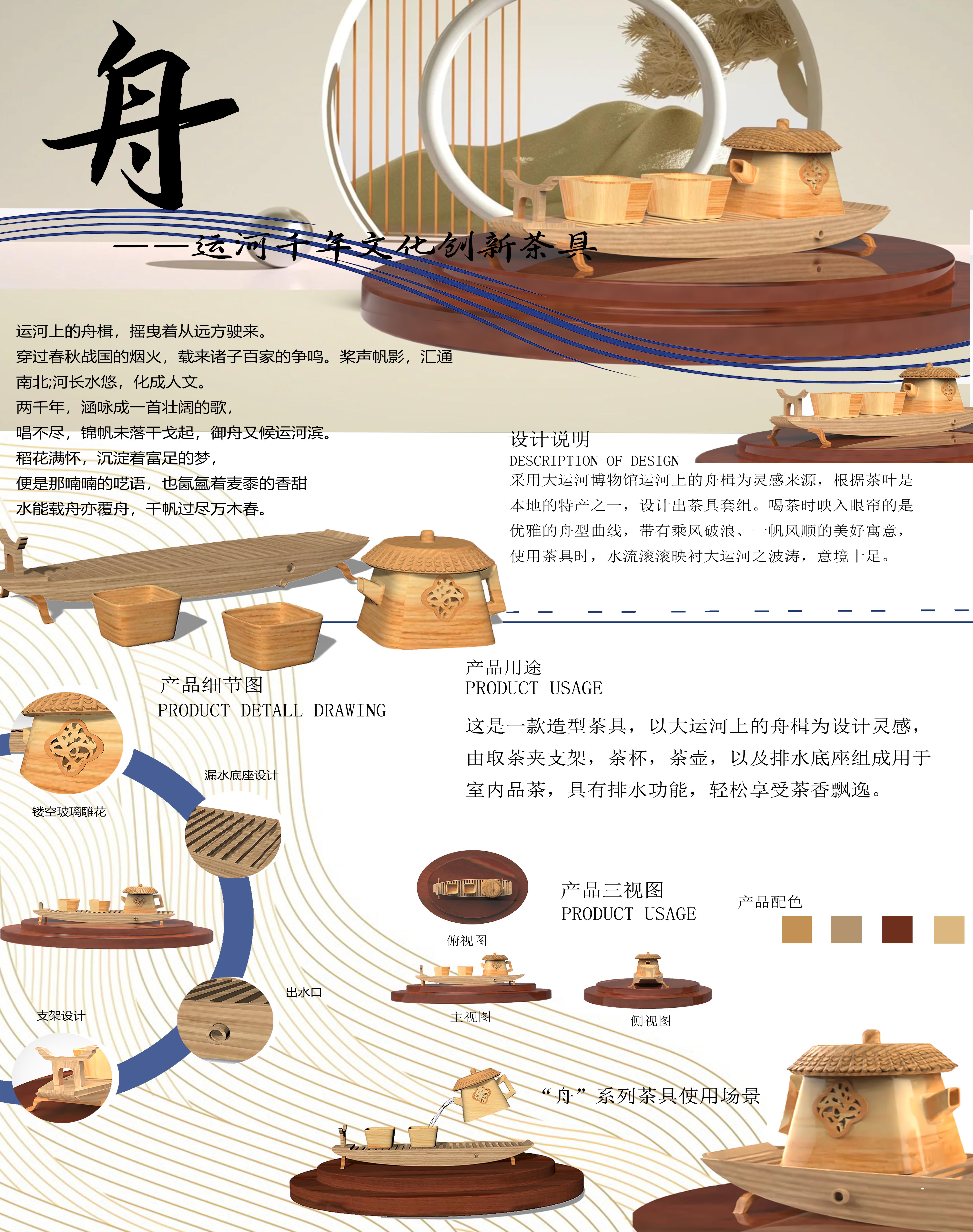 采用大运河博物馆运河上的舟楫为灵感来源,根据茶叶是本地的特产之一,设计出茶具套组。喝茶时映入眼帘的是优雅的舟型曲线,带有乘风破浪、一帆风顺的美好寓意,使用茶具时,水流滚滚映衬大运河之波涛,意境十足。