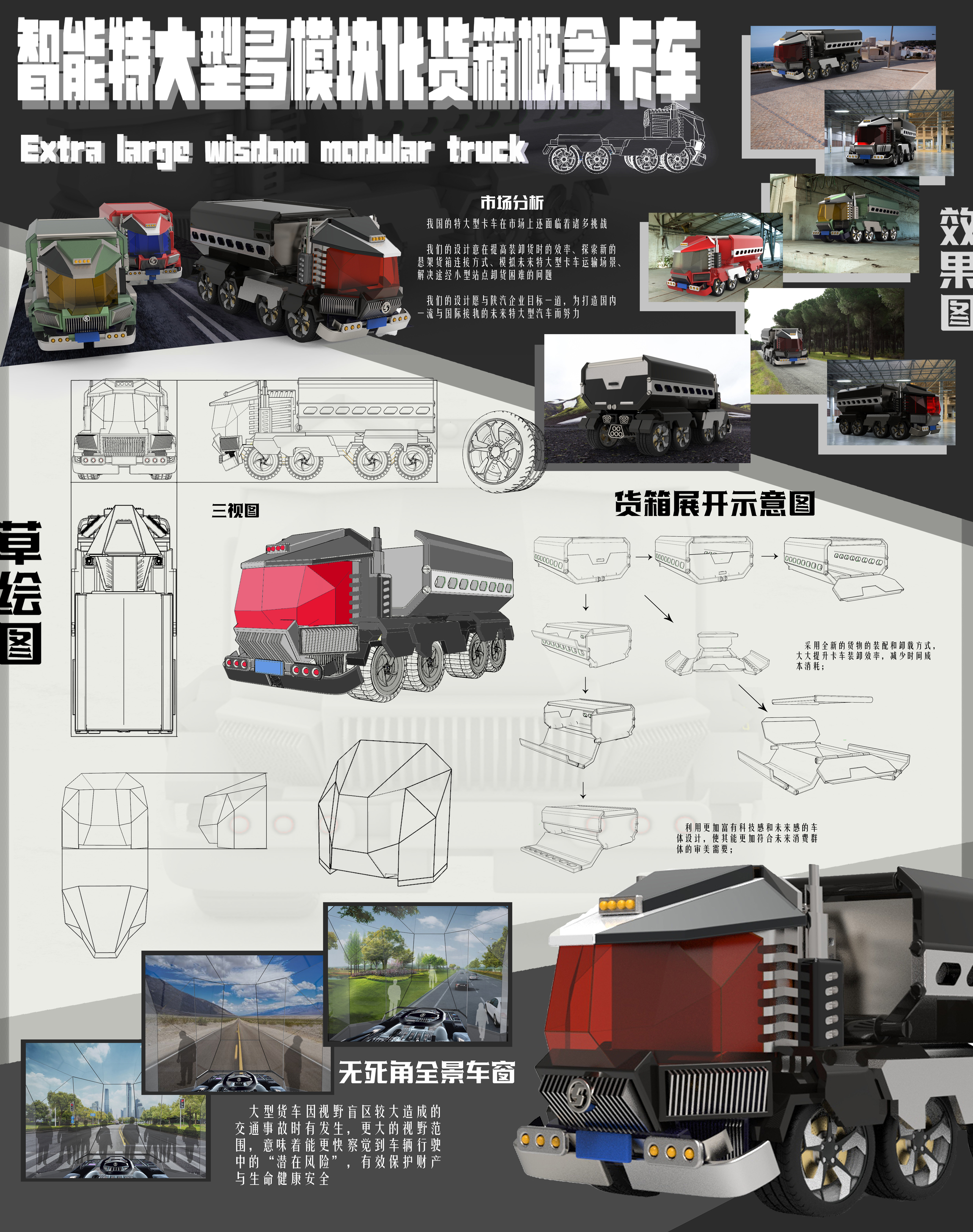 本设计是意在探索未来中国重型运输卡车的发展方向,意图提高中国交通运输业效率,解决重型运输卡车目前所存在的运输效率低下以及装卸货物安全性有待提高的行业问题,本设计创新点在多模块化设计思路在卡车货箱方面的应用和发展,全景式无死角车窗可以提高司机的驾驶安全性和行人生命安全,可根据司机需求合理调整的可变车身结构,促进我国重型卡车领域的发展进步。