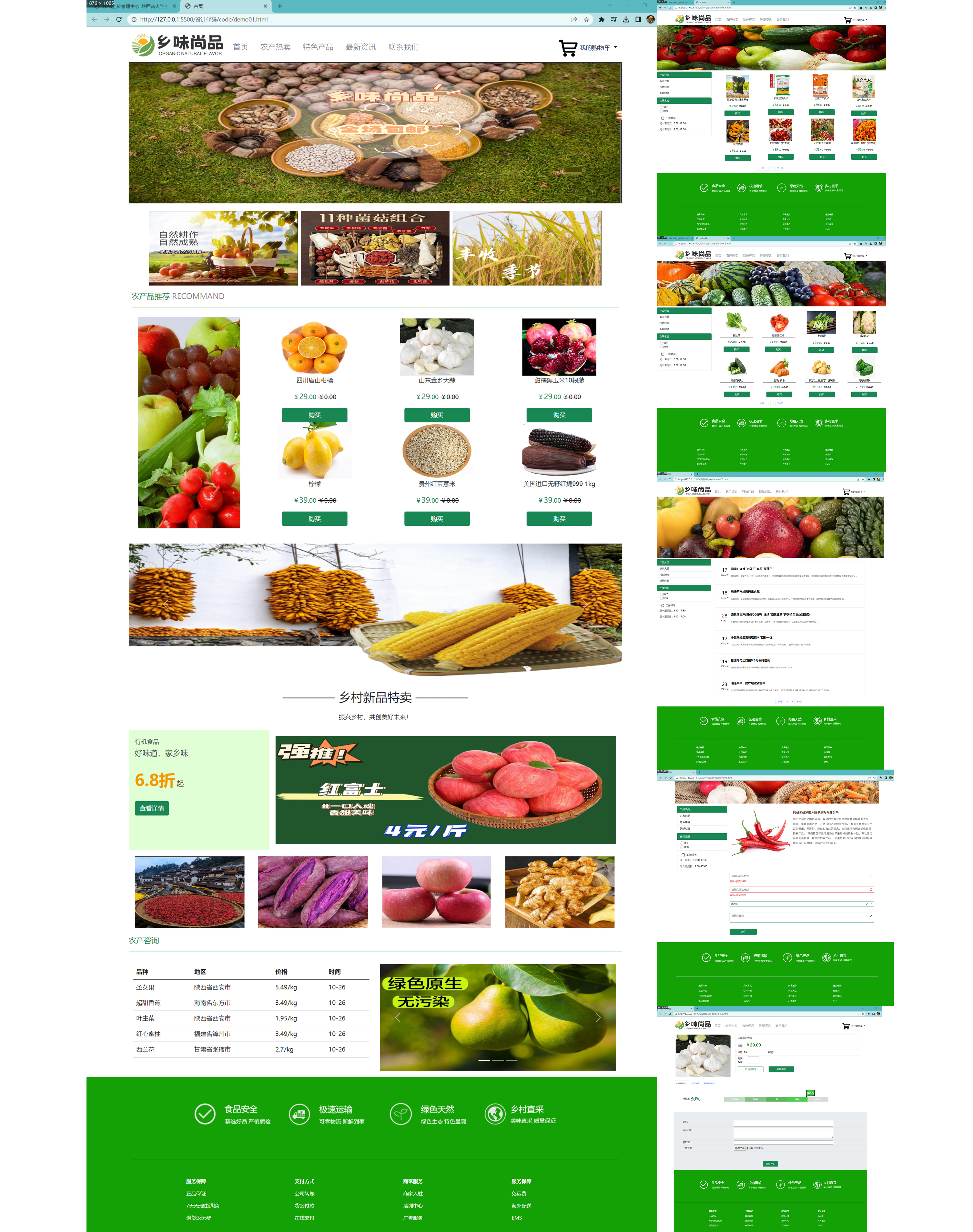 我们的项目是一个展示乡村特色农产品的在线平台。有6个页面,首页,展示农产品的推荐,特价农产品和农产品咨询。第二个农产热卖网页,展示目前乡村正在热销的产品。第三个特色产品页面,是各个乡村别具特色的农产品。第四个最新咨询网页,展示农产咨询,即不同地区的有关农产品的相关报道。第五个联系我们,用户有想法建议,投诉,通过此联系我们。第六个跳转页面,提供用户评价和推荐功能,可分享自己的购买体验,推荐给其他人。