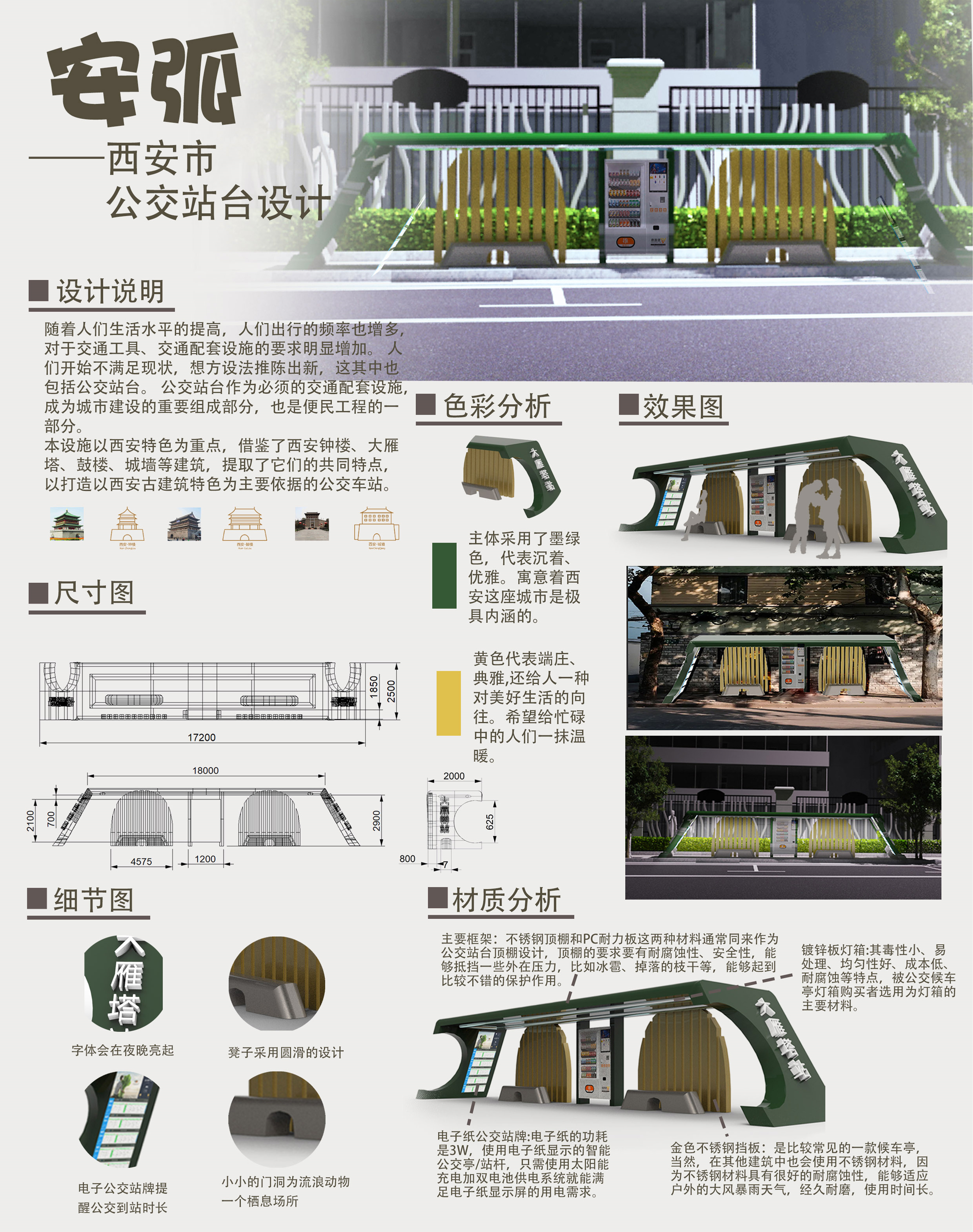 随着人们生活水平的提高,人们出行的频率也增多对于交通工具、交通配套设施的要求明显增加。人们开始不满足现状,想方设法推陈出新,这其中也包括公交站台。公交站台作为必须的交通配套设施,成为城市建设的重要组成部分,也是便民工程的一部分。 本设施以西安特色为重点,借鉴了西安钟楼、大雁塔、鼓楼、城墙等建筑,提取了它们的共同特点,以打造以西安古建筑特色为主要依据的公交车站。