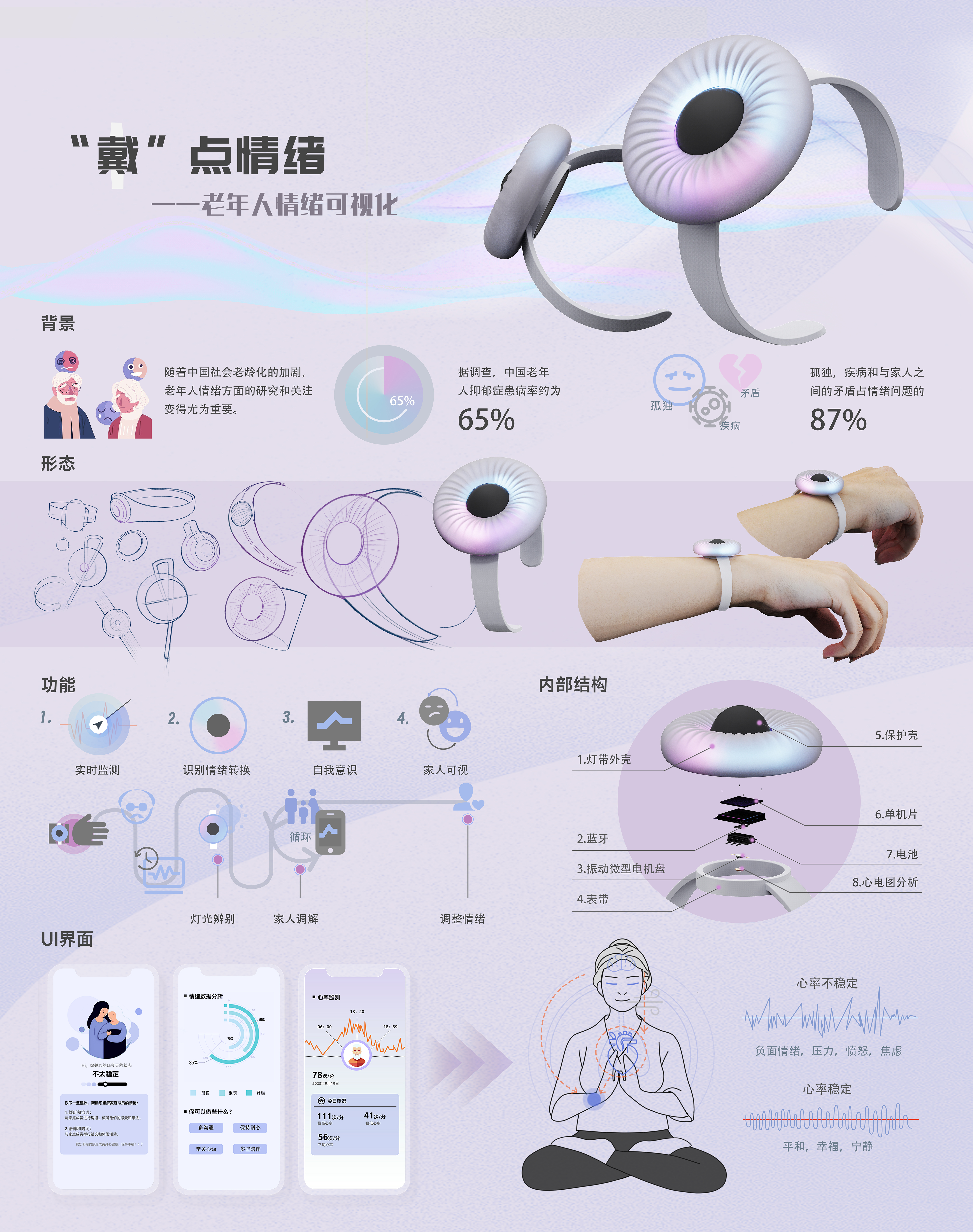 情绪安抚穿戴设备是专为老年人设计的智能穿戴产品,旨在协助他们维持情绪健康。其外观类似于一款手表,以直观的方式传达用户的情绪状态,提供实时的情感支持和干预。当用户情绪稳定时,设备会散发柔和的白光呼吸灯,而在情绪波动或不稳定时,橘色的明亮闪烁将引起用户和照顾者的注意。