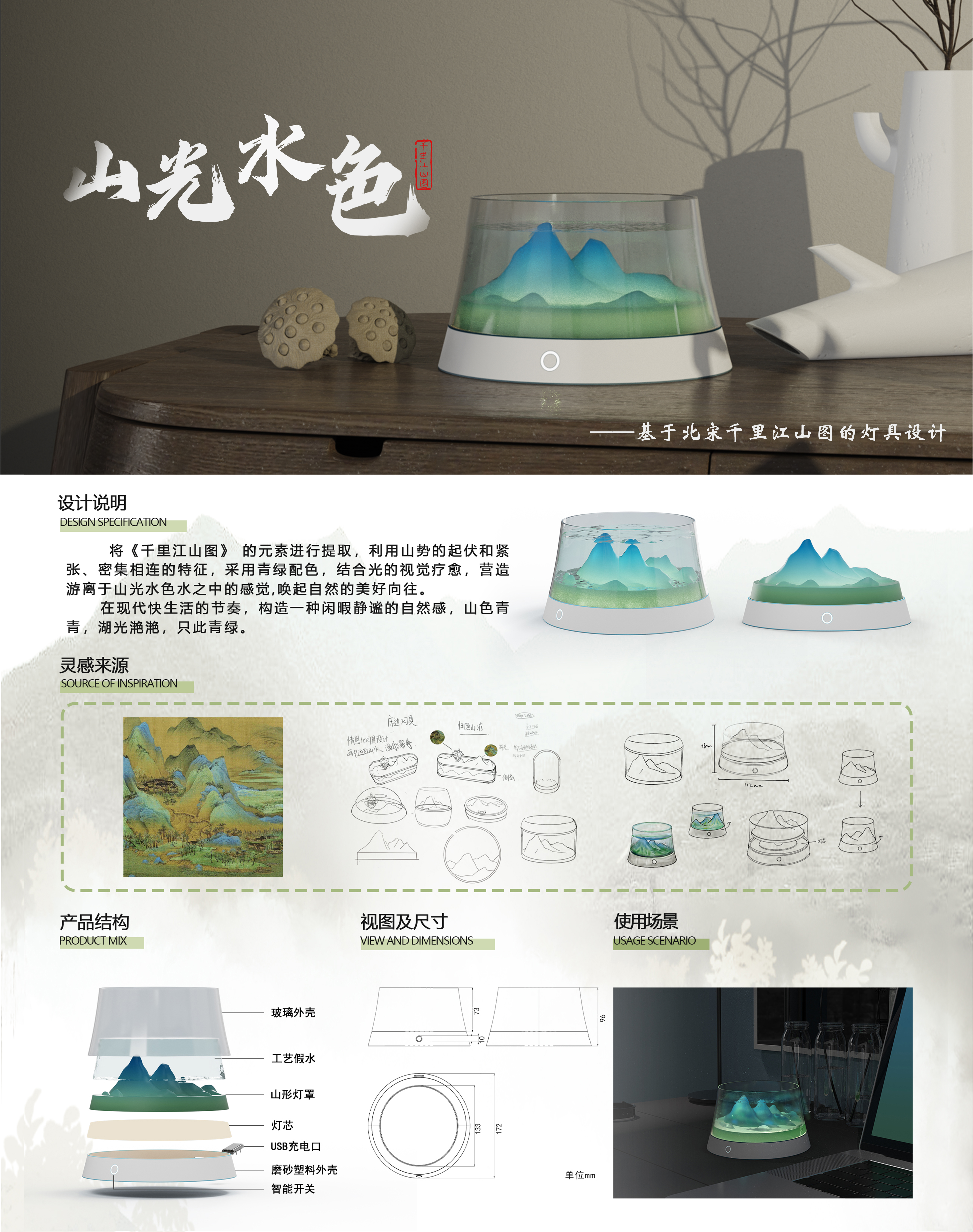 将《千里江山图》的元素进行提取,利用山势的起伏和紧张、密集相连的特征,采用青绿配色,结合光的视觉疗愈,营造游离于山光水色水之中的感觉,唤起自然的美好向往。在现代快生活的节奏,构造一种闲暇静谧的自然感,山色青青,湖光滟滟,只此青绿。