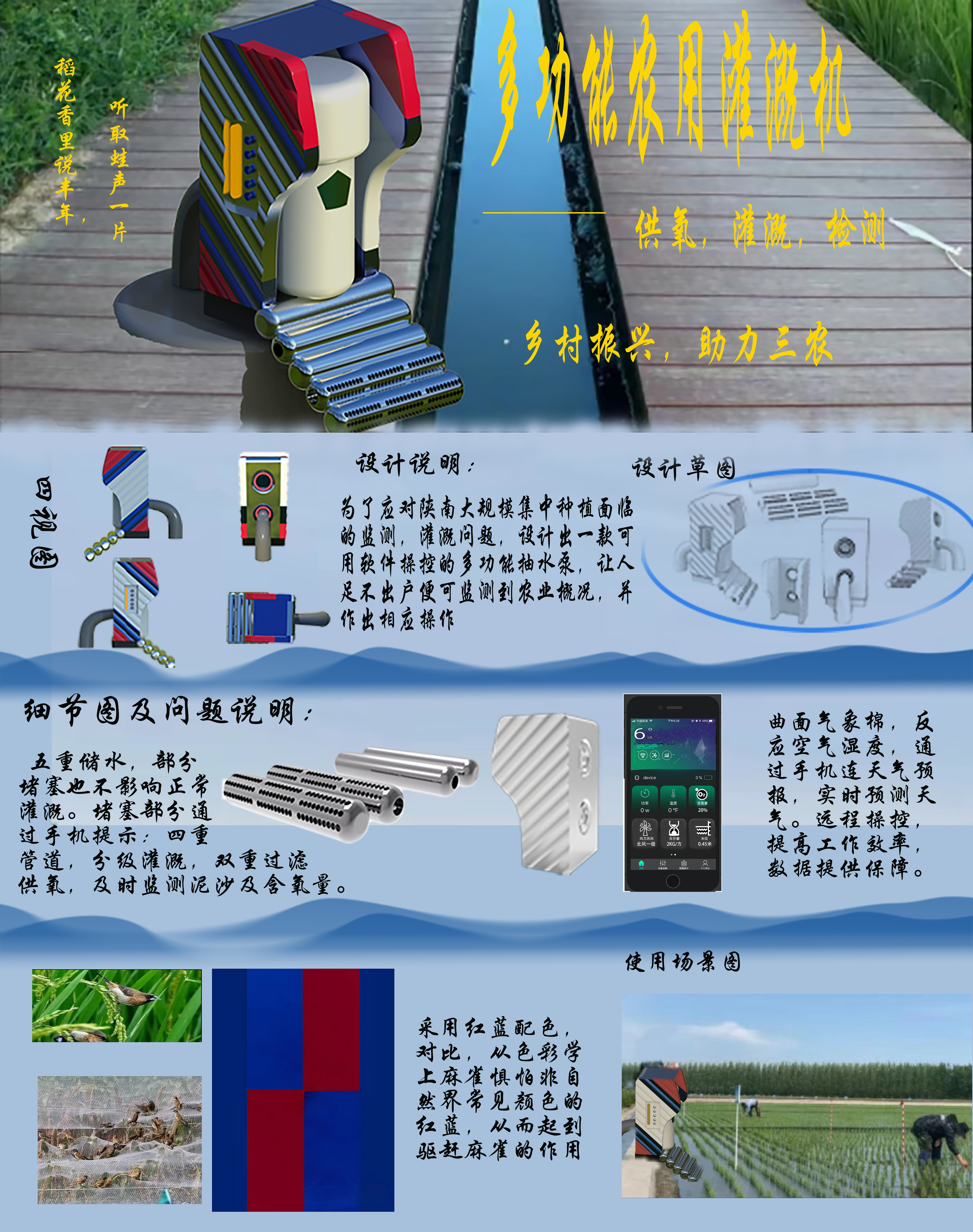 为了应对陕南大规模集中种植面临的检测,灌溉问题,设计出一款可用软件操控的多功能灌溉机,集渔业充氧,农业监测灌溉于一体的灌溉机器,让人足不出户便可监测农业概况,并进行应对。