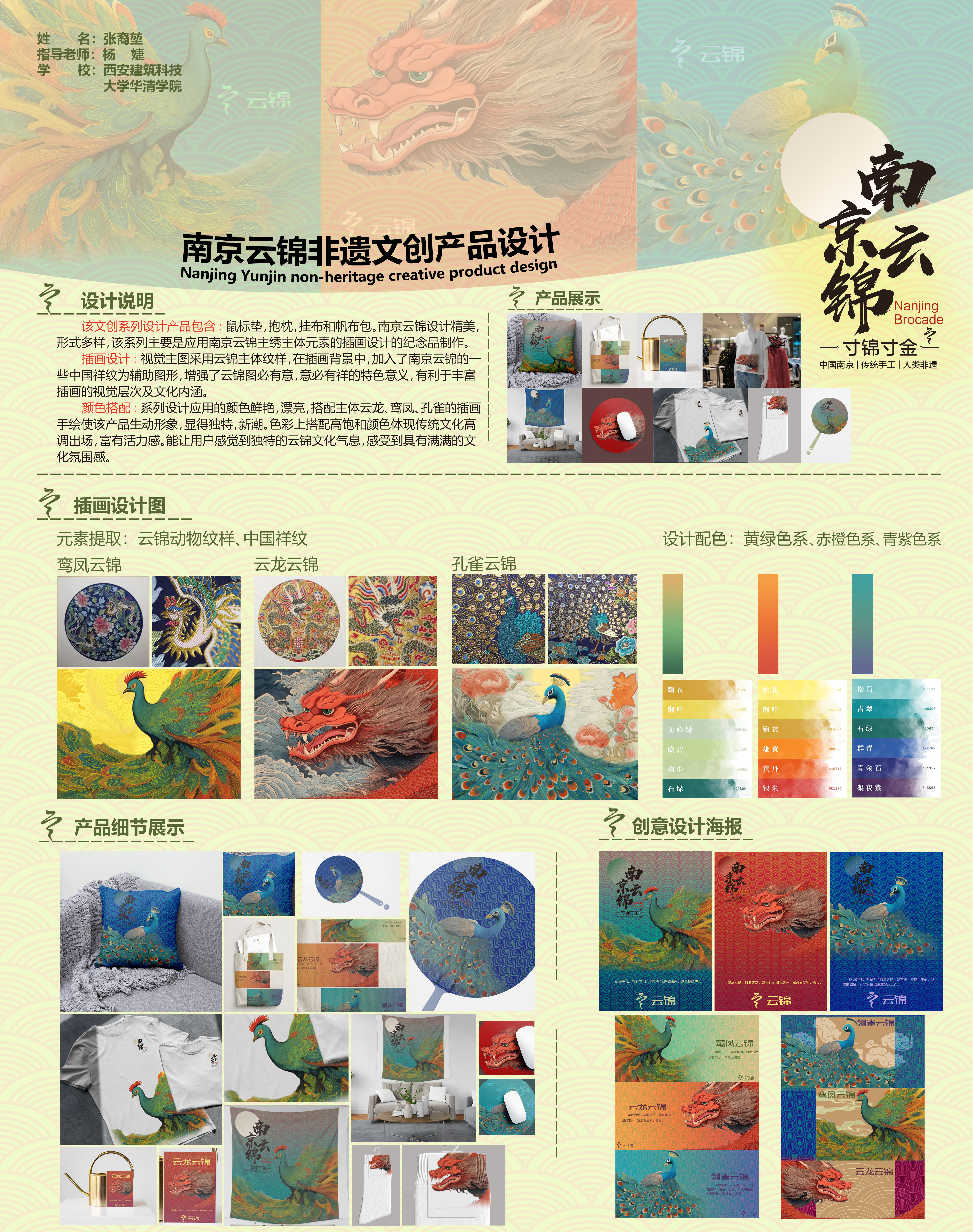 该系列主要是应用南京云锦主绣主体元素的插画设计的纪念品制作。视觉主图采用云锦主体纹样,在插画背景中,加入了云锦祥纹为辅助图形,增强了云锦图必有意,意必有祥的特色意义,丰富插画的视觉层次及文化内涵。系列设计应用的颜色鲜艳,搭配主体云龙、鸾凤、孔雀的插画手绘使产品生动形象,显得独特,新潮。色彩上搭配高饱和颜色体现传统文化富有活力感。能让用户感觉到独特的云锦文化气息,感受到具有满满的文化氛围感。