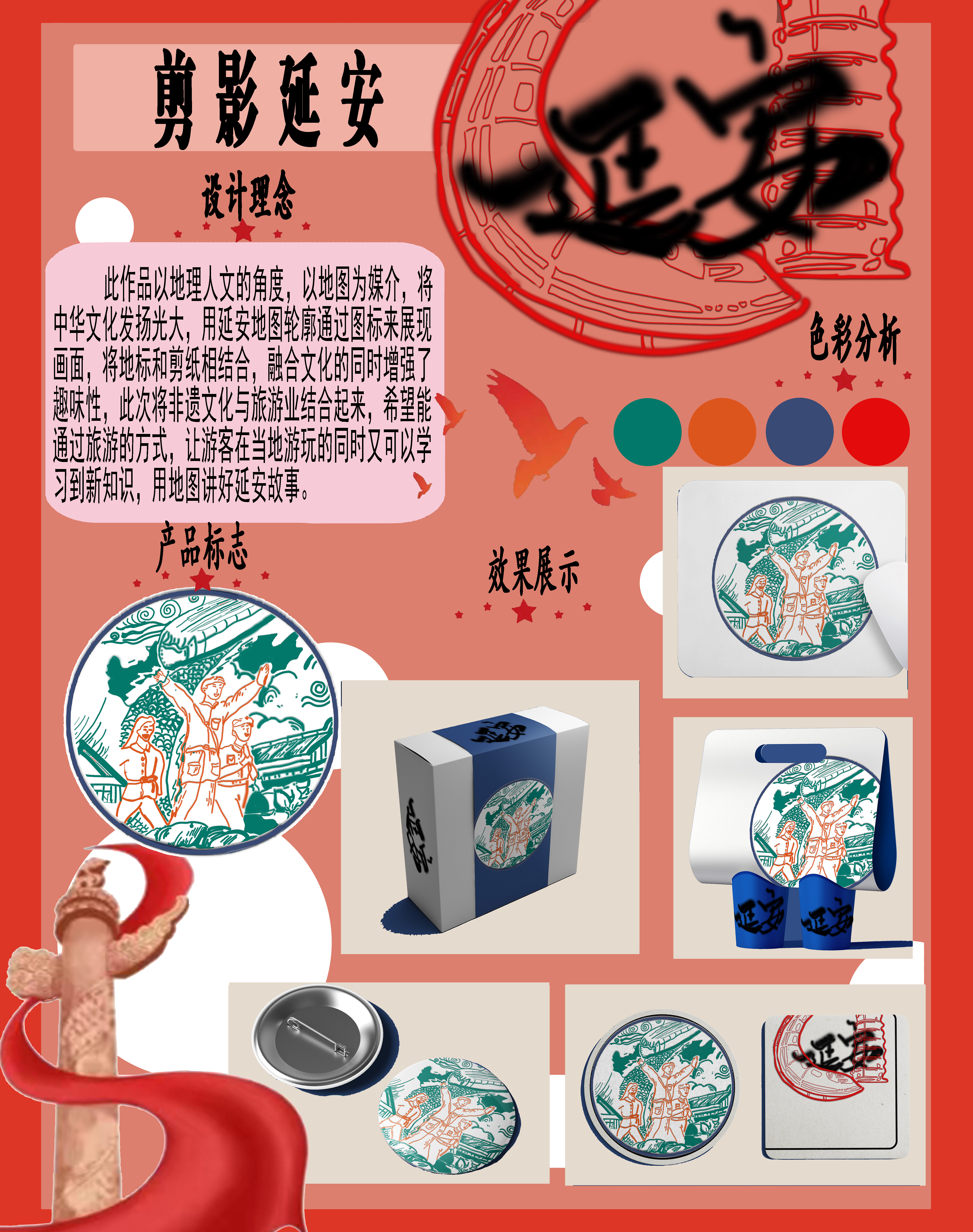 此作品以地理人文的角度,以地图为据介,将中华文化发扬光大,用延安地图轮廓通过图标来展现画面,将地标和勇纸相结合,融合文化的同时增短惠乐性,此次将非造文化与旅济业结合记来,希望能通过旅游的方式,让游客在当地游玩的同时又可以学习到新知识,用地图讲好诞安故事.