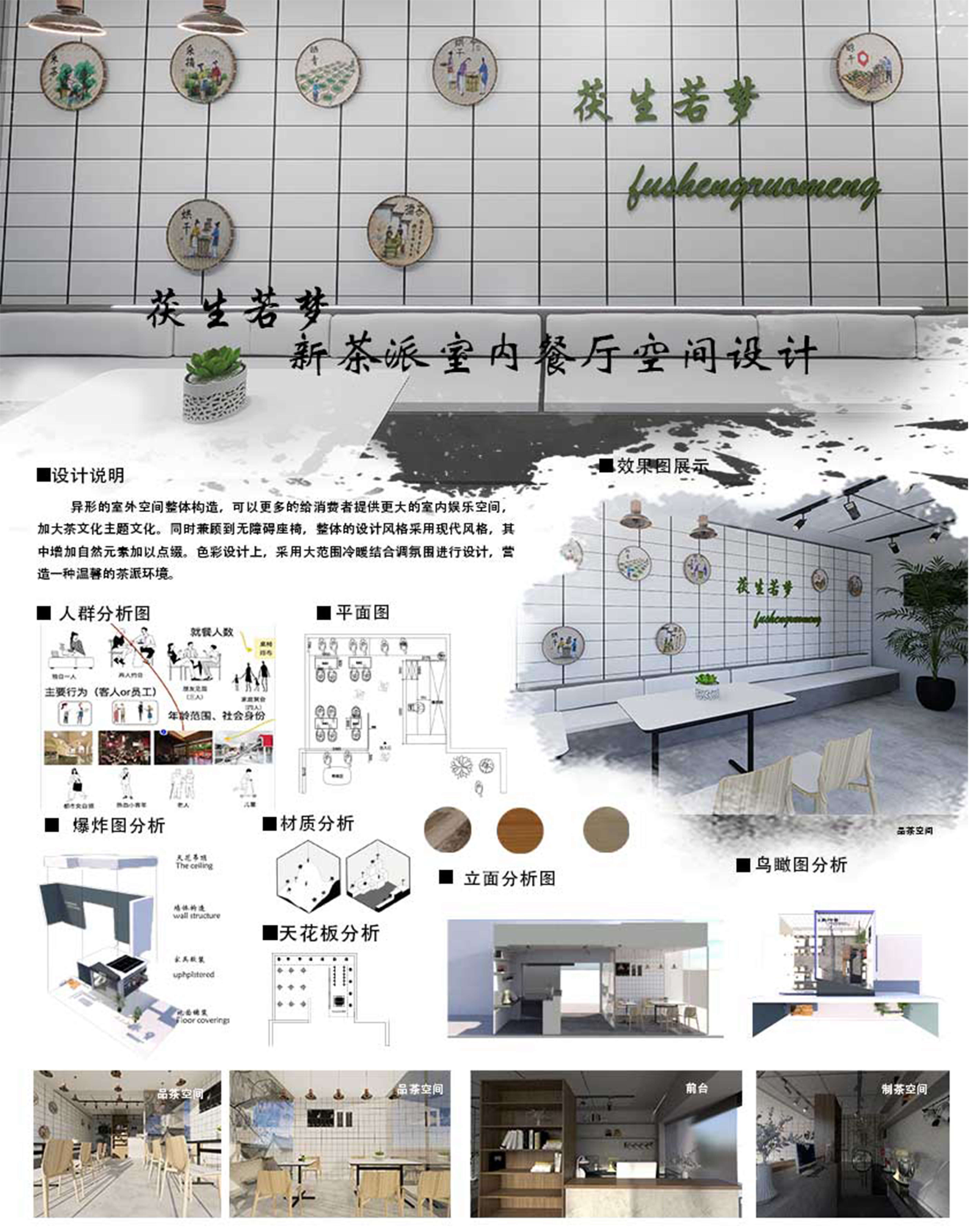 异形的室外空间整体构造,可以更多的给消费者提供更大的室内娱乐空间,加大茶文化宣传。同时兼顾到无障碍设计,整体的设计风格采用现代风格,其中增加自然元素加以点缀。色彩设计上,采用大范围冷暖色调结合氛围进行设计,营造一种温馨的茶派环境。