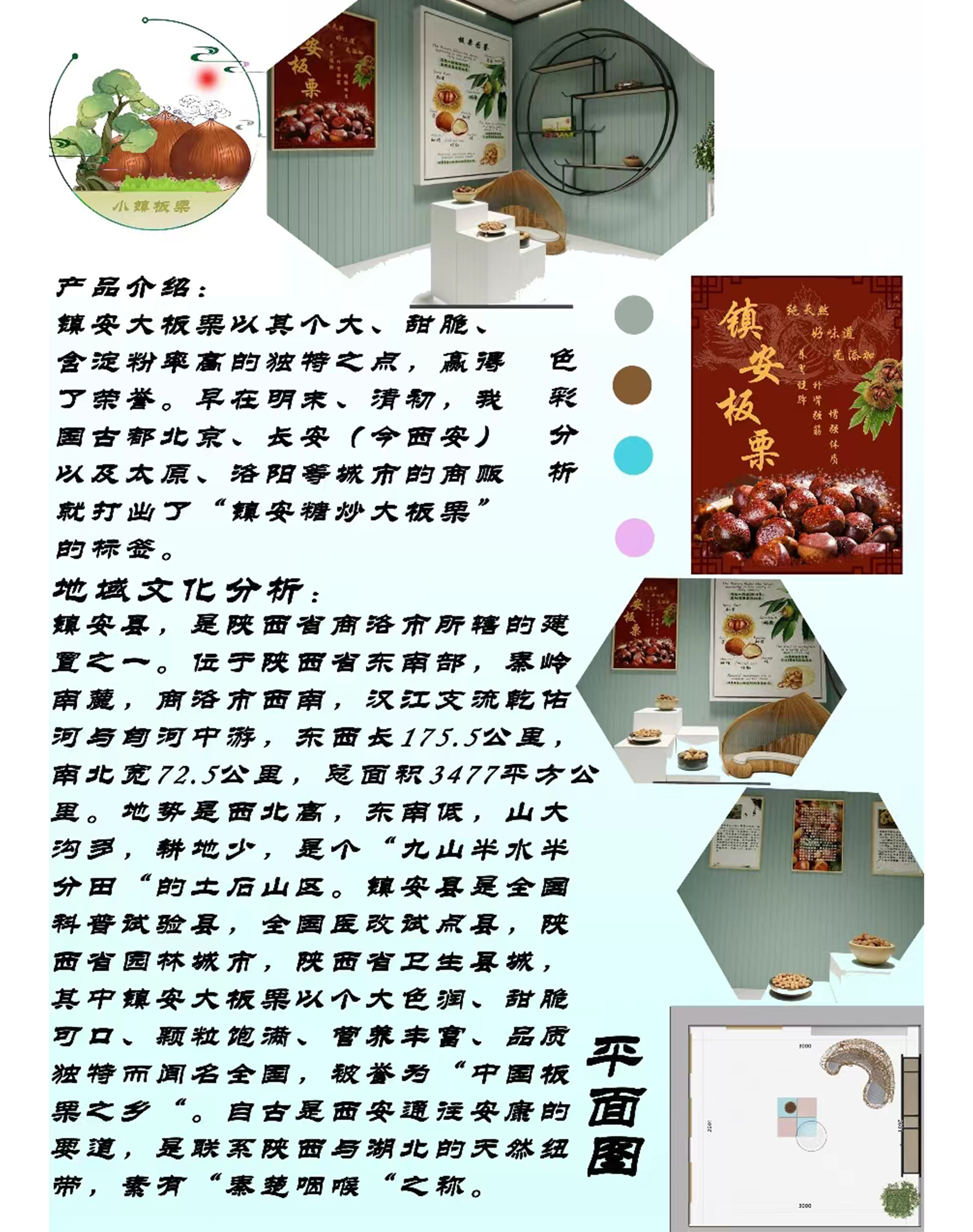 作品采用镇安板栗为原型,建造3*3m的展馆,馆内介绍镇安板栗相关信息以及其价值。对于板栗相关构造进行介绍,同时也让人们了解镇安的地域文化。采用板栗相关特征进行设计相关产品。