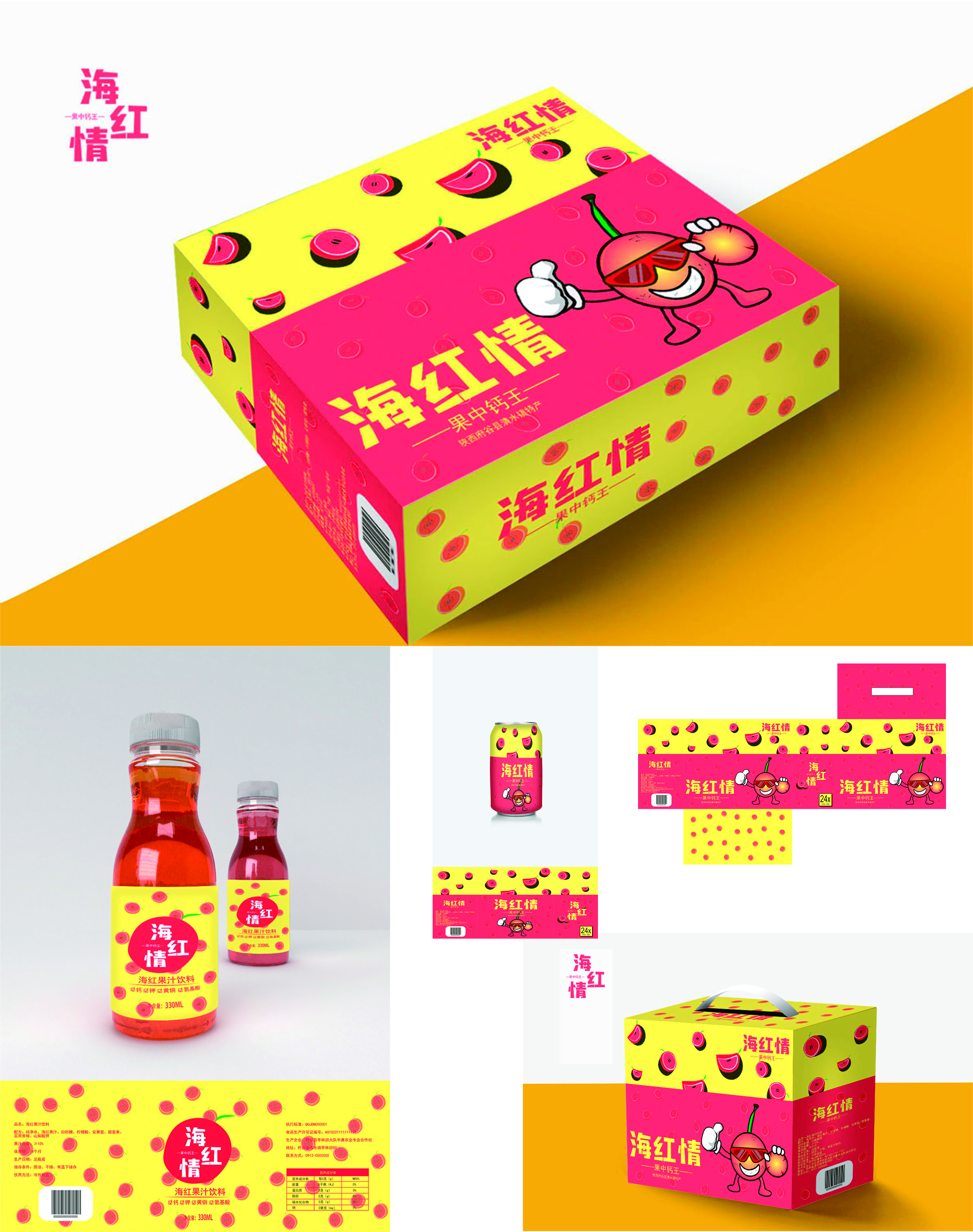 本产品是府谷当地的特色产品海红果所制成的果汁饮料,所以本包装选用了纯度较低的红色和黄色作为此次包装的主要色调,主要体现的是海红果汁酸甜、美味的食物特征。在视觉是是用手绘的形式设计了卡通拟物化的山楂果作为主形象,将原有的产品logo进行了再次设计,选用的随意较粗的笔画来体现产品名称,整体形象时尚、新颖,适用于现代年轻人、儿童以及大部分消费群体的视觉感。