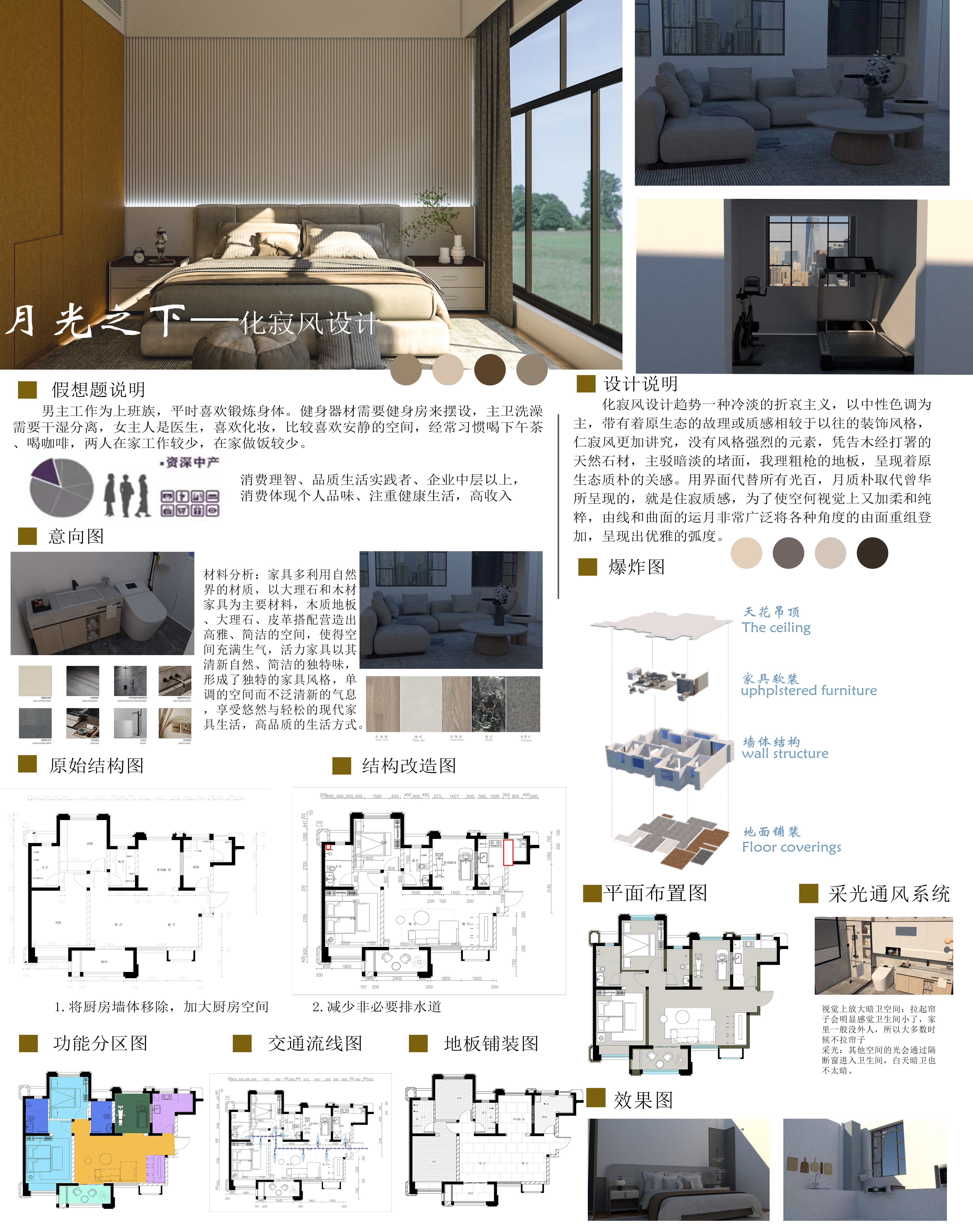 化寂风设计趋势一种冷淡的折哀主义,以中性色调为 主,带有着原生态的故理或质感相较于以往的装饰风格, 仁寂风更加讲究,没有风格强烈的元素,凭告木经打署的 天然石材,主驳暗淡的堵面,我理粗枪的地板,呈现着原 生态质朴的关感。用界面代替所有光百,月质朴取代曾华 所呈现的,就是住寂质感,为了使空何视觉上又加柔和纯 粹,由线和曲面的运月非常广泛将各种角度的由面重组登 加,呈现出优雅的弧度。