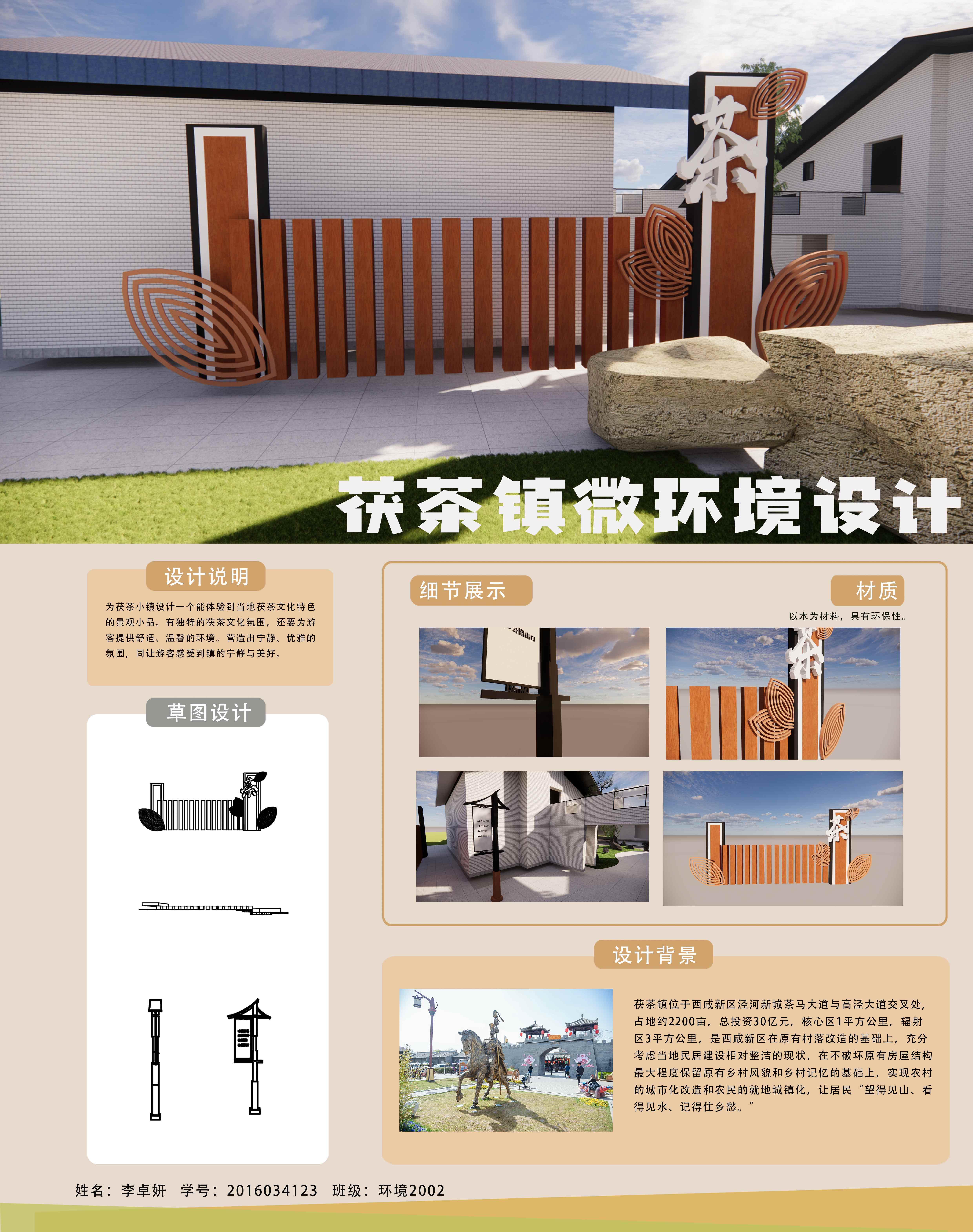 为茯茶小镇设计一个能体验到当地茯茶文化特色的景观小品。有独特的茯茶文化氛围,还要为游客提供舒适、温馨的环境。营造出宁静、优雅的氛围,同让游客感受到镇的宁静与美好。