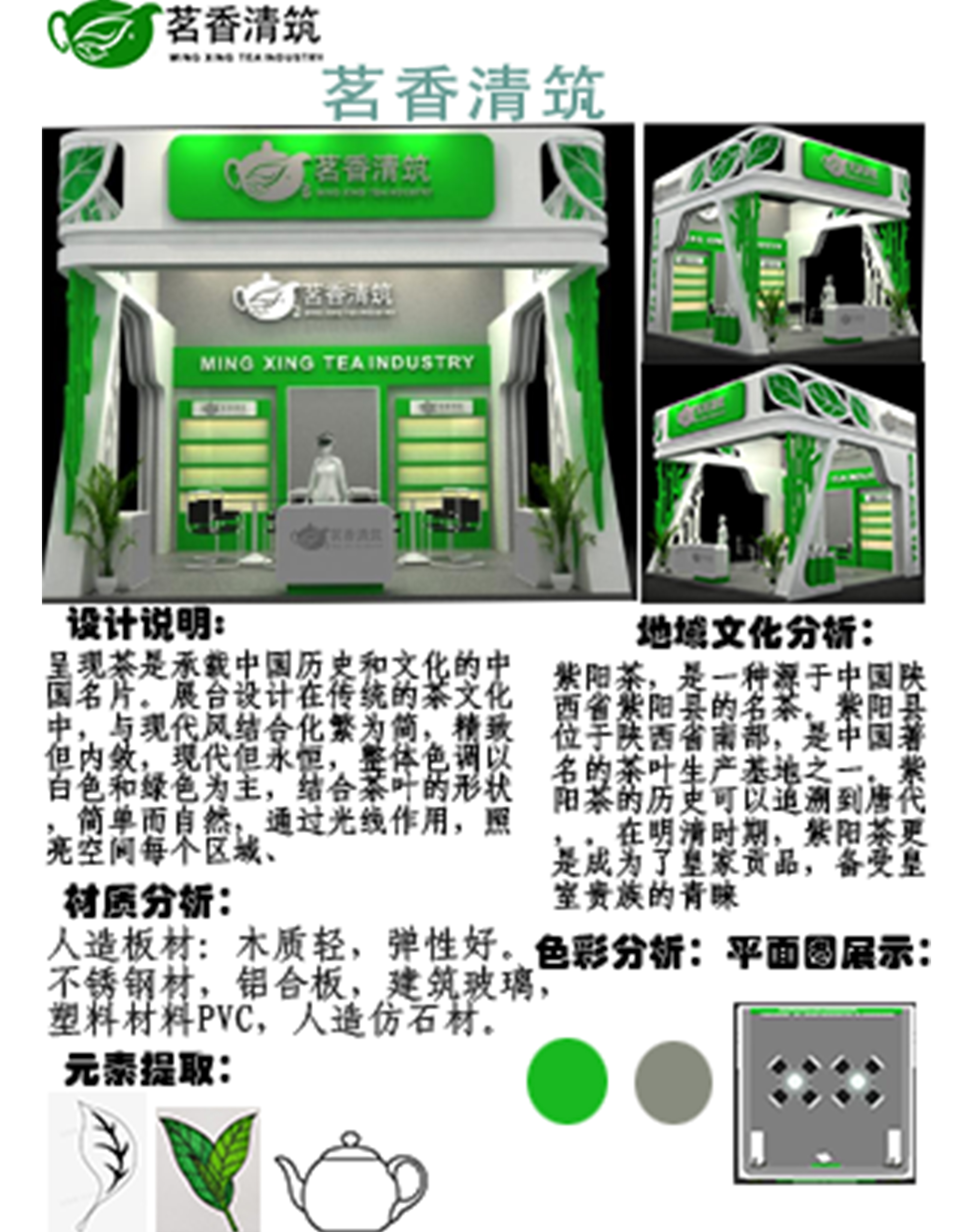 呈现茶是承载中国历史和文化的中国名片。展台设计在传统的茶文化中,与现代风结合化繁为简,精致但内敛,现代但永恒,整体色调以白色和绿色为主,结合茶叶的形状,简单而自然,通过光线作用,照亮空间每个区域、