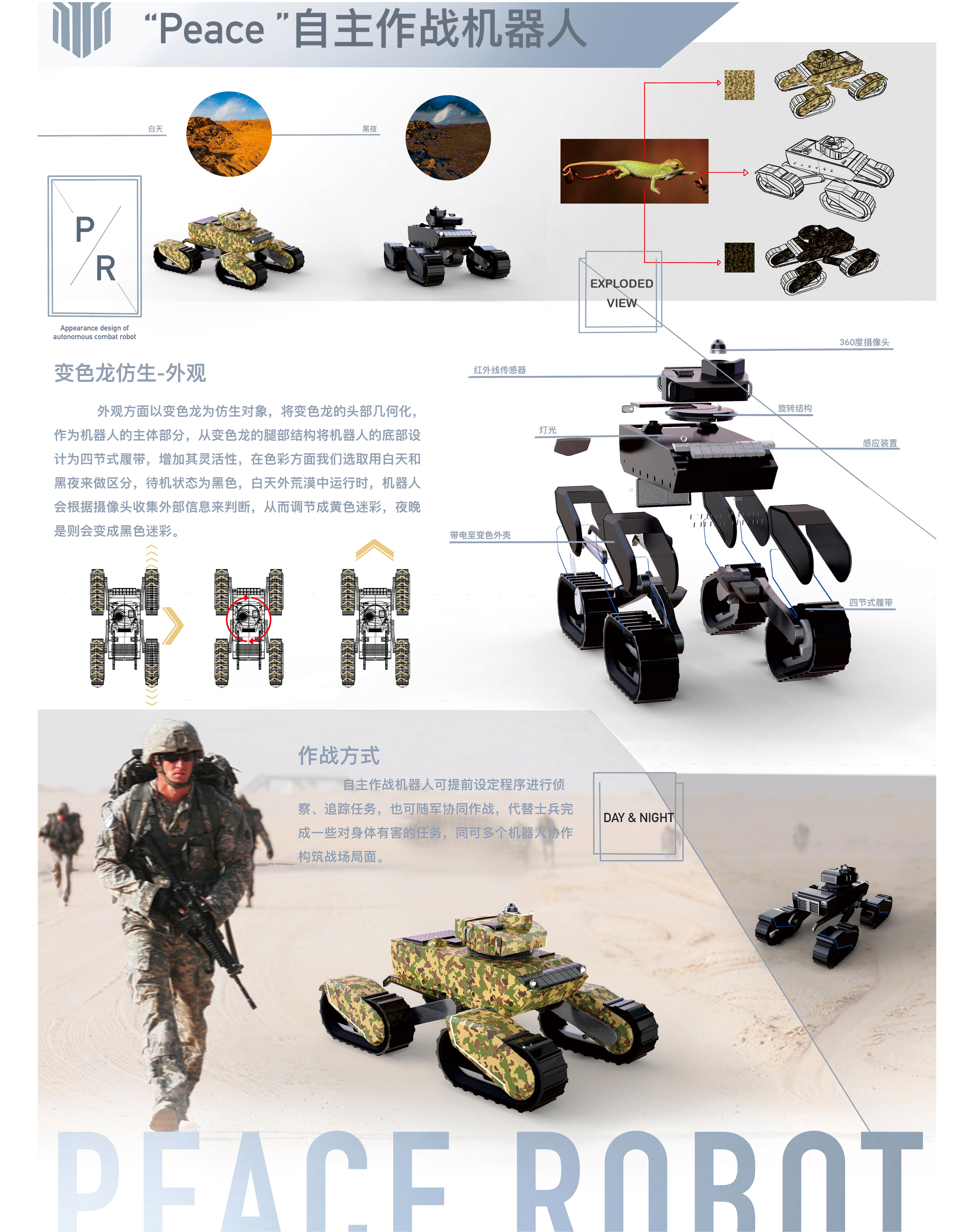 自主作战机器人创新设计,针对侦查、潜伏、追踪、收集战场信息作为主要功能,安装有超声传感器可以自主避障,行驶速度可以设定最大是1.2m/s,辅助士兵作战,也可以设置程序长期的侦查活动,以变色龙作为仿生对象,提取头部特征,行进部分采用四节式履带,提升稳定性的同时增加灵活性,以变色龙变色作为灵感,设想将外观上使用带电致变色的图层,根据白天黑夜不同场景进行切换事先设定好的程序色彩,提升作战机器人的隐蔽性。