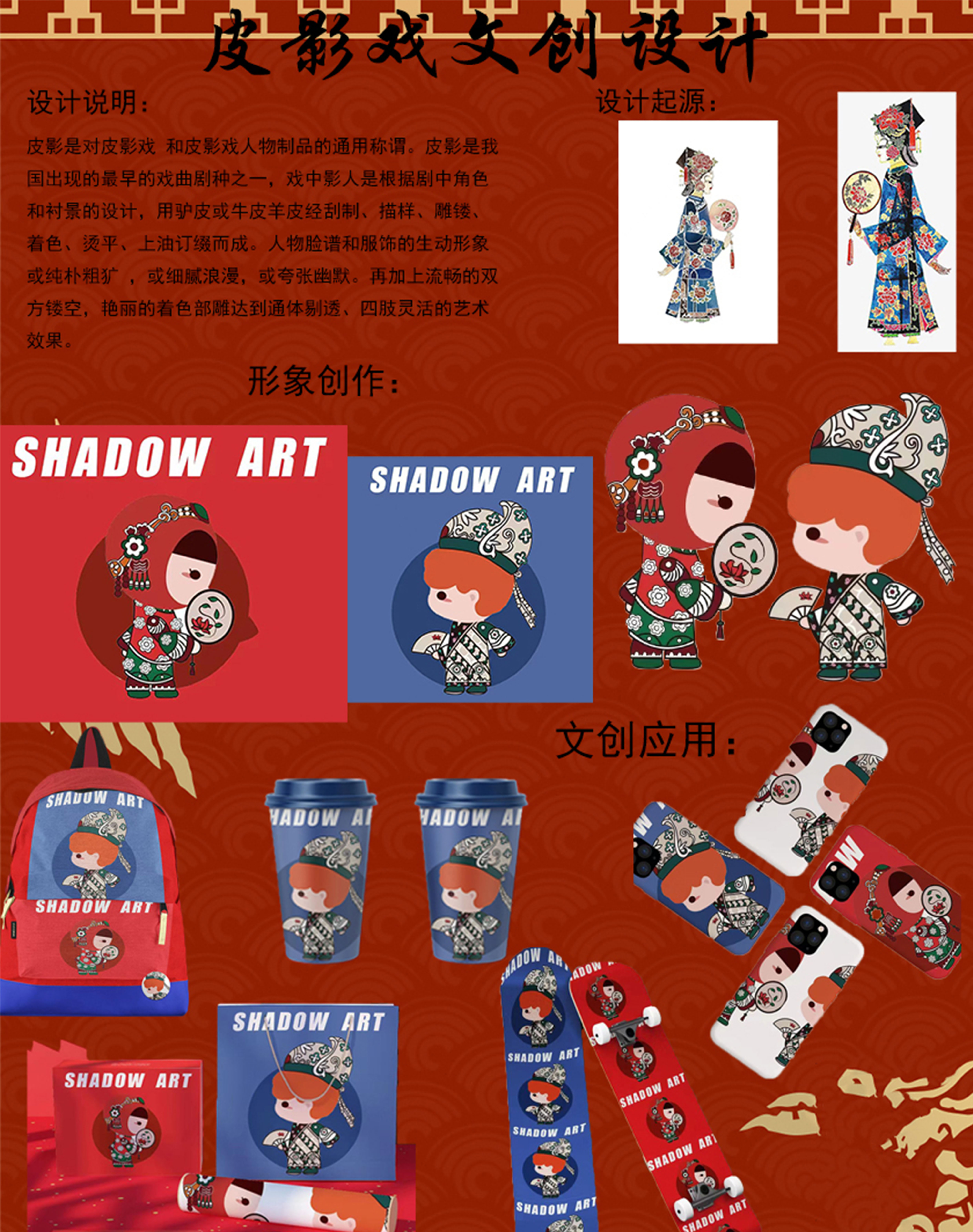 皮影是对皮影戏和皮影戏人物制品的通用称谓。皮影是我国出现的最早的戏曲剧种之一,戏中影人是根据剧中角色和衬景的设计,用驴皮或牛皮羊皮经刮制、描样、雕镂、着色、烫平、上油订缀而成。人物脸谱和服饰的生动形象或纯朴粗犷,或细腻浪漫,或夸张幽默。再加, 上流畅的双方镂空,艳丽的着色部雕达到通体剔透、四肢灵活的艺术效果。