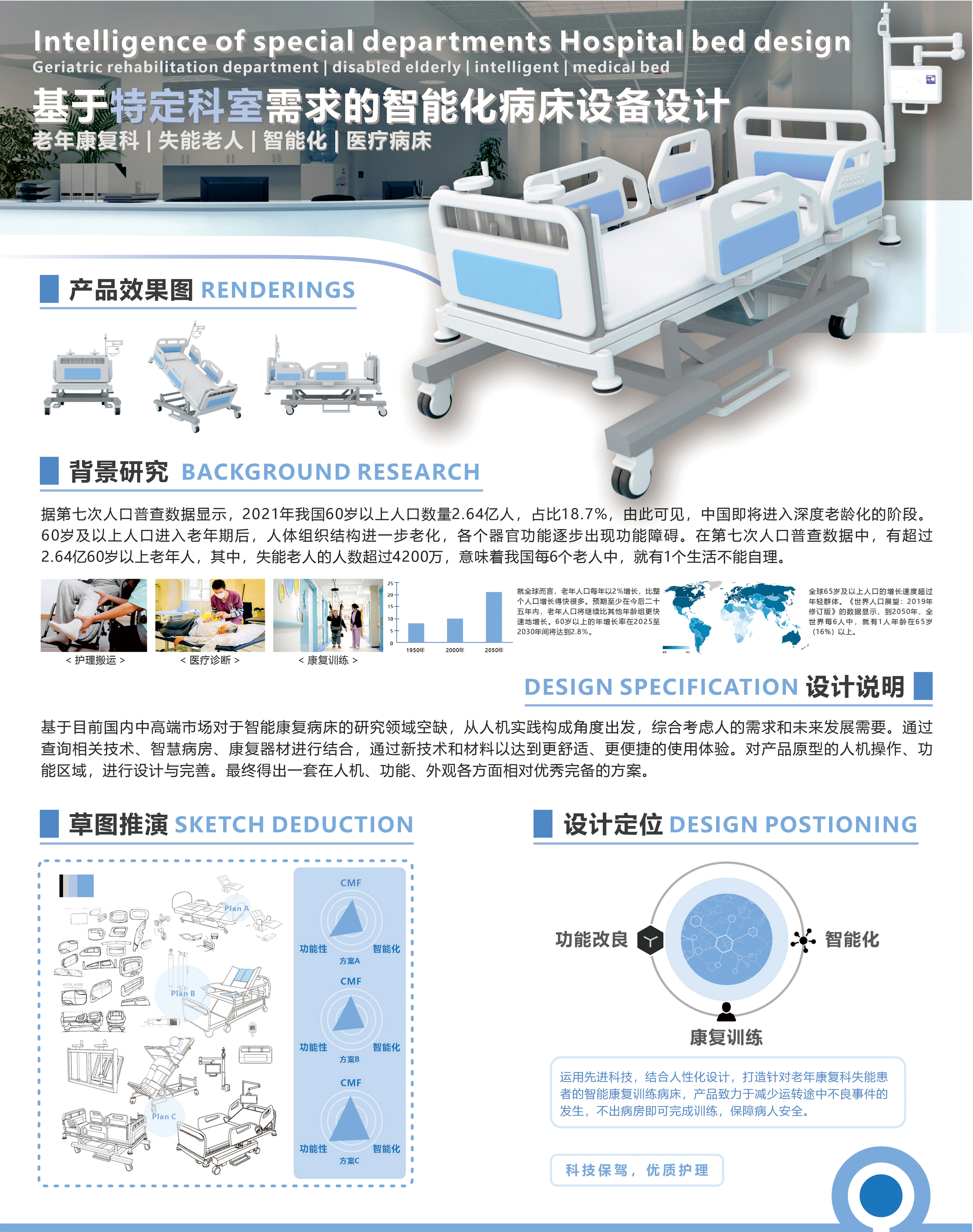 基于目前国内中高端市场对于智能康复病床的研究领域空缺,从人机实践构成角度出发,综合考虑人的需求和未来发展需要。通过查询相关技术、智慧病房、康复器材进行结合,通过新技术和材料以达到更舒适、更便捷的使用体验。对产品原型的人机操作、功能区域,进行设计与完善。最终得出一套在人机、功能、外观各方面相对优秀完备的方案。