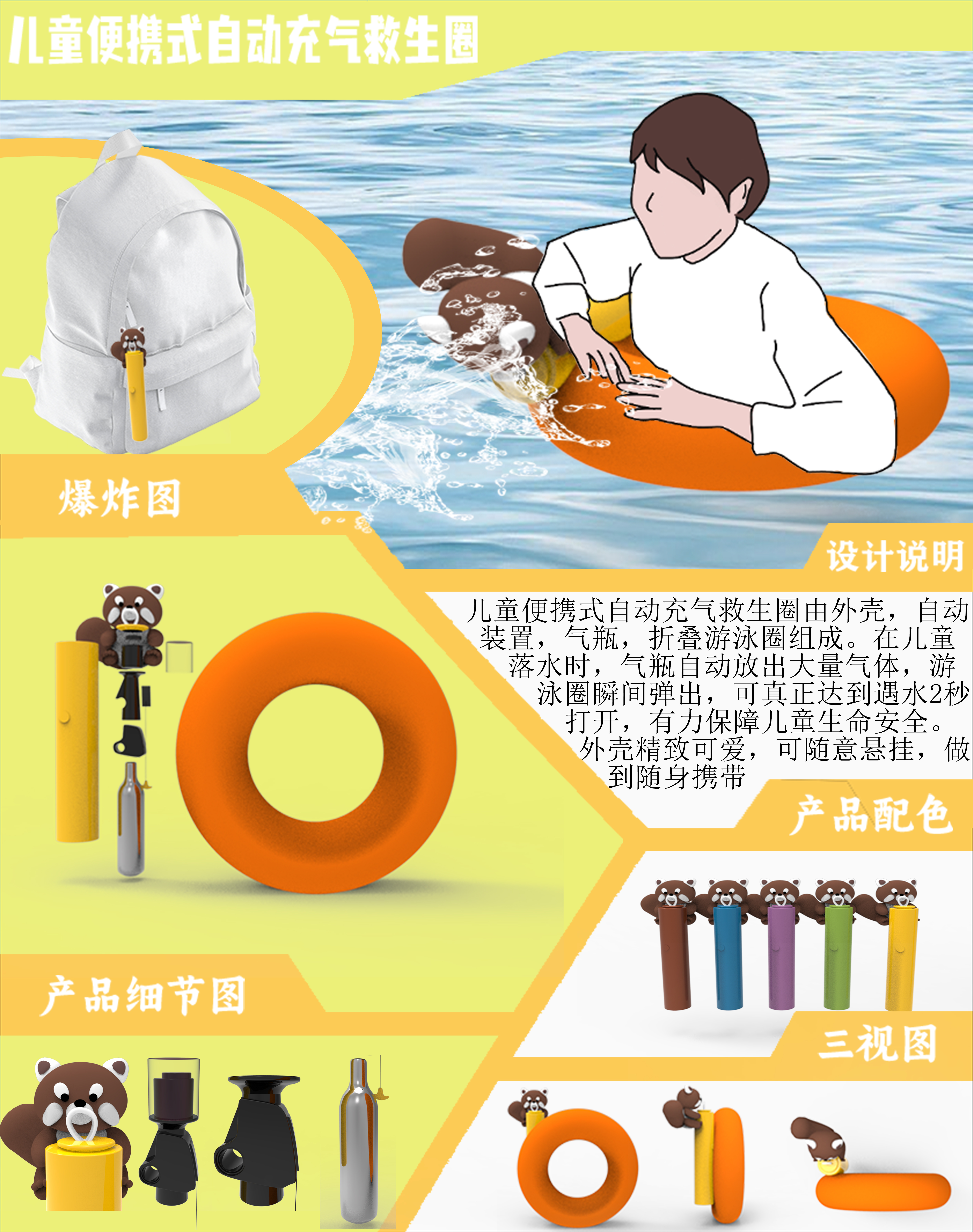 儿童便携式自动充气救生圈由外壳,自动装置,气瓶,折叠游泳圈组成。在儿童落水时,气瓶自动放出大量气体,游泳圈瞬间弹出,可真正达到遇水2秒打开,有力保障儿童生命安全。外壳精致可爱,可随意悬挂,做到随身携带.