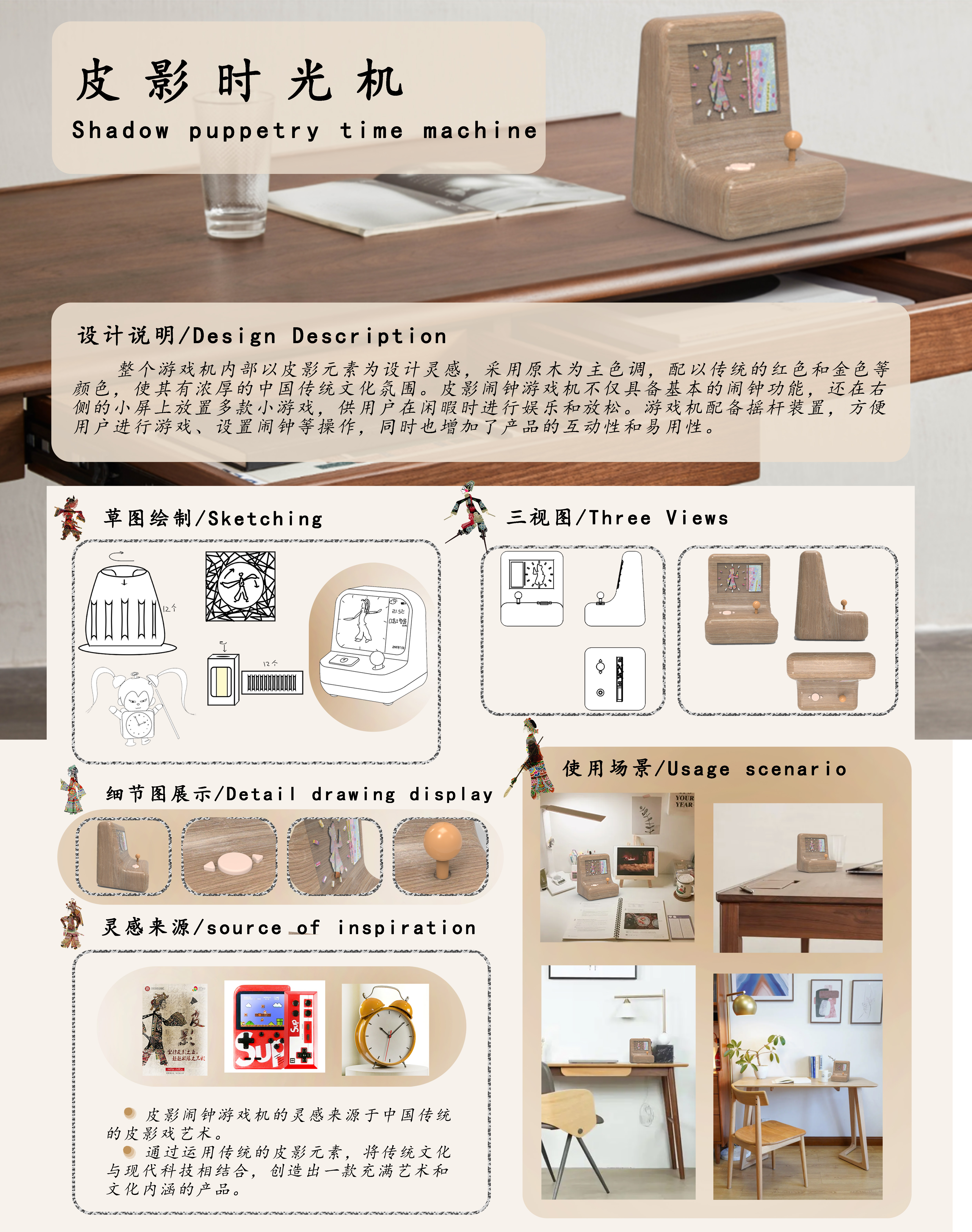 整个游戏机内部以皮影元素为设计灵感,采用原木为主色调,配以传统的红色和金色等颜色,使其有浓厚的中国传统文化氛围。皮影闹钟游戏机不仅具备基本的闹钟功能,还在右侧的小屏上放置多款小游戏,供用户在闲暇时进行娱乐和放松。游戏机配备摇杆装置,方便用户进行游戏、设置闹钟等操作,同时也增加了产品的互动性和易用性。