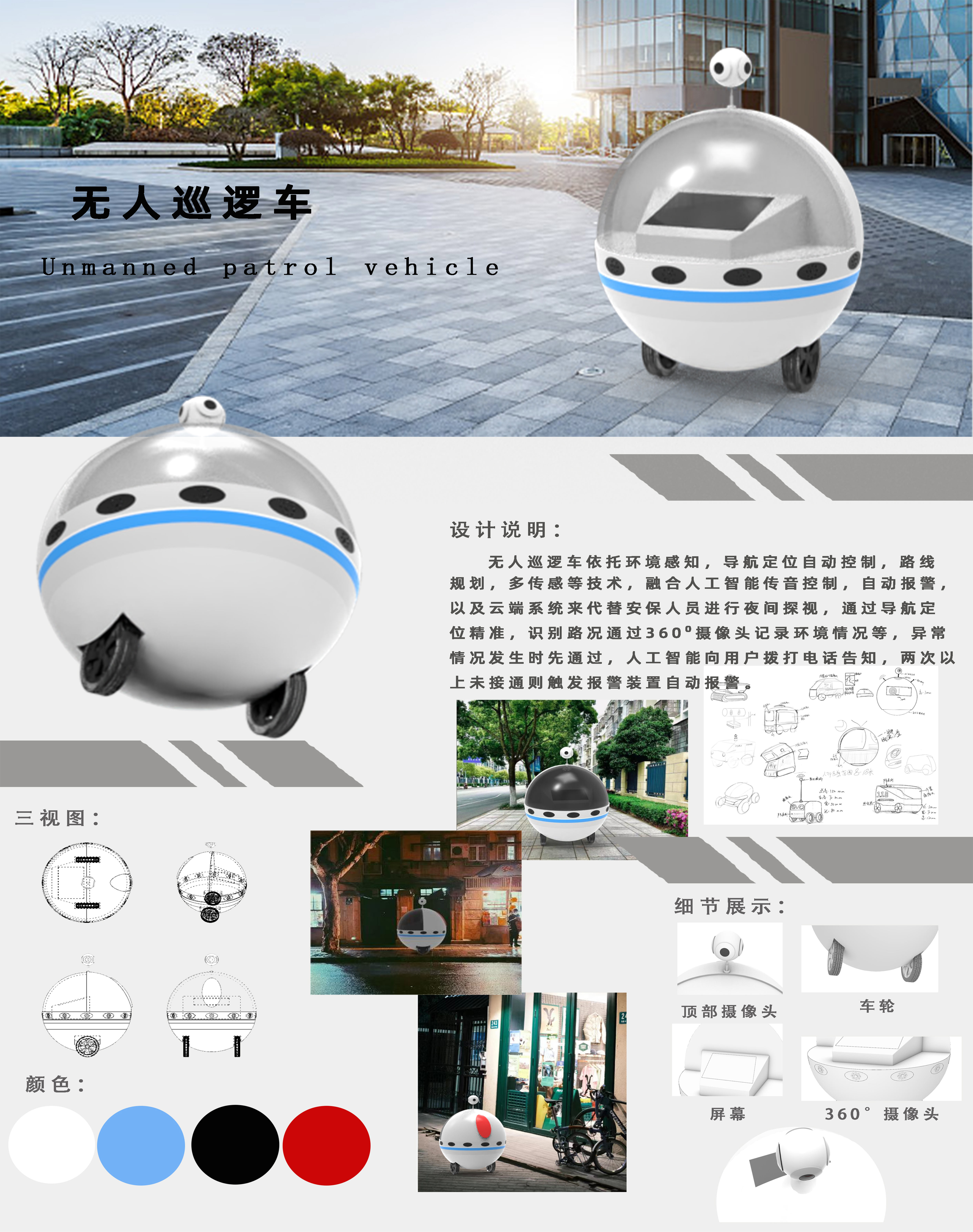 设计说明 无人巡逻车依托环境感知,导航定位自动控制,路线规划,多传感等技术,融合人工智能传音控制,自动报警以及云端系统来代替安保人员进行夜间探视,通过导航定位精准,识别路况通过360摄像头记录环境情况等,异常情况发生时先通过,人工智能向用户拨打电话告知,两次以上未接通则触发报警装置自动报警。