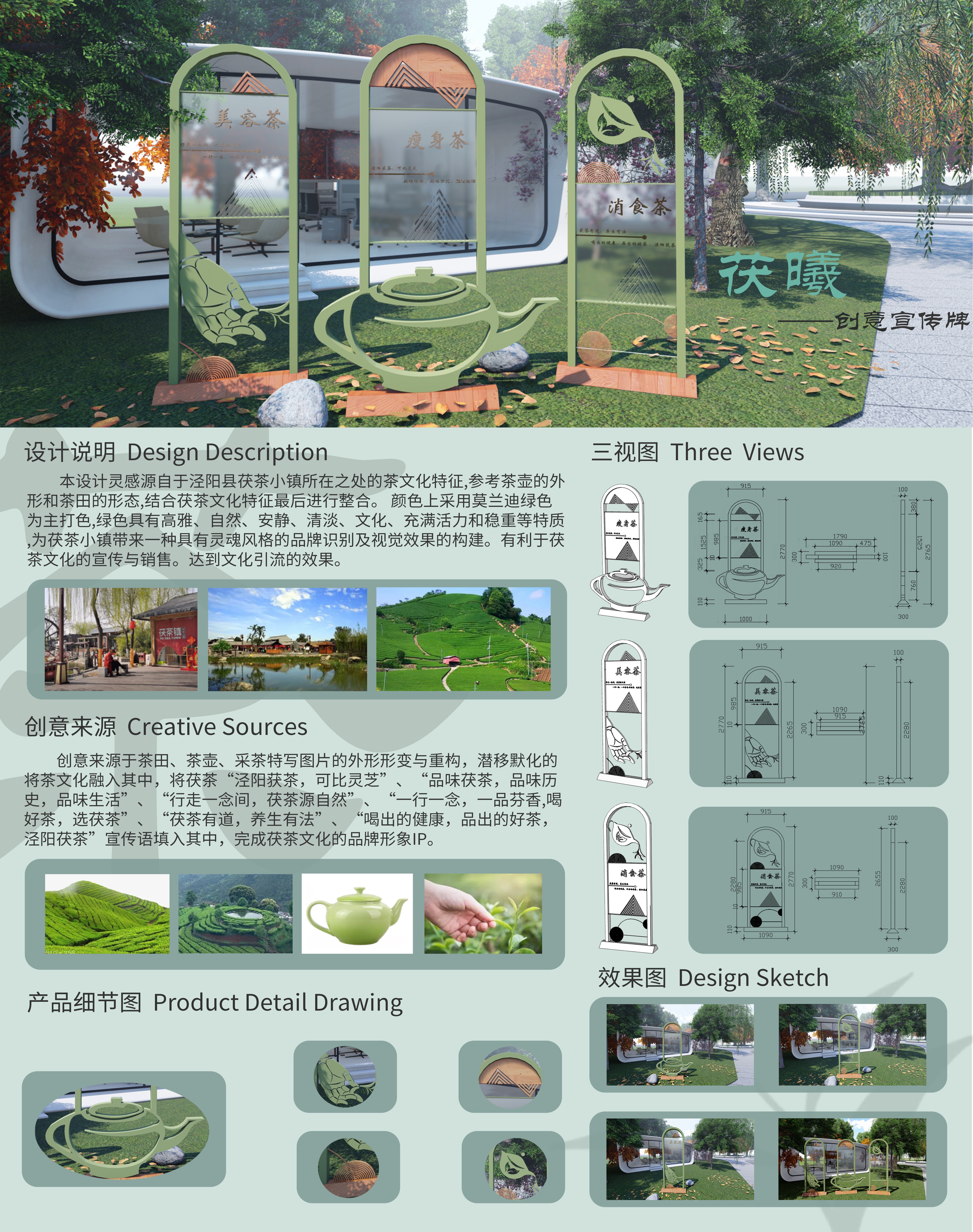 本设计灵感源自于泾阳县茯茶小镇所在之处的茶文化特征,参考茶壶的外形和茶田的形态,结合茯茶文化特征最后进行形变整合。 颜色上采用莫兰迪绿色为主打色,绿色具有高雅、自然、安静、清淡、文化、充满活力和稳重等特质,为茯茶小镇带来一种具有灵魂风格的品牌识别及视觉效果的构建。有利于茯茶文化的宣传与销售。达到文化引流的效果。