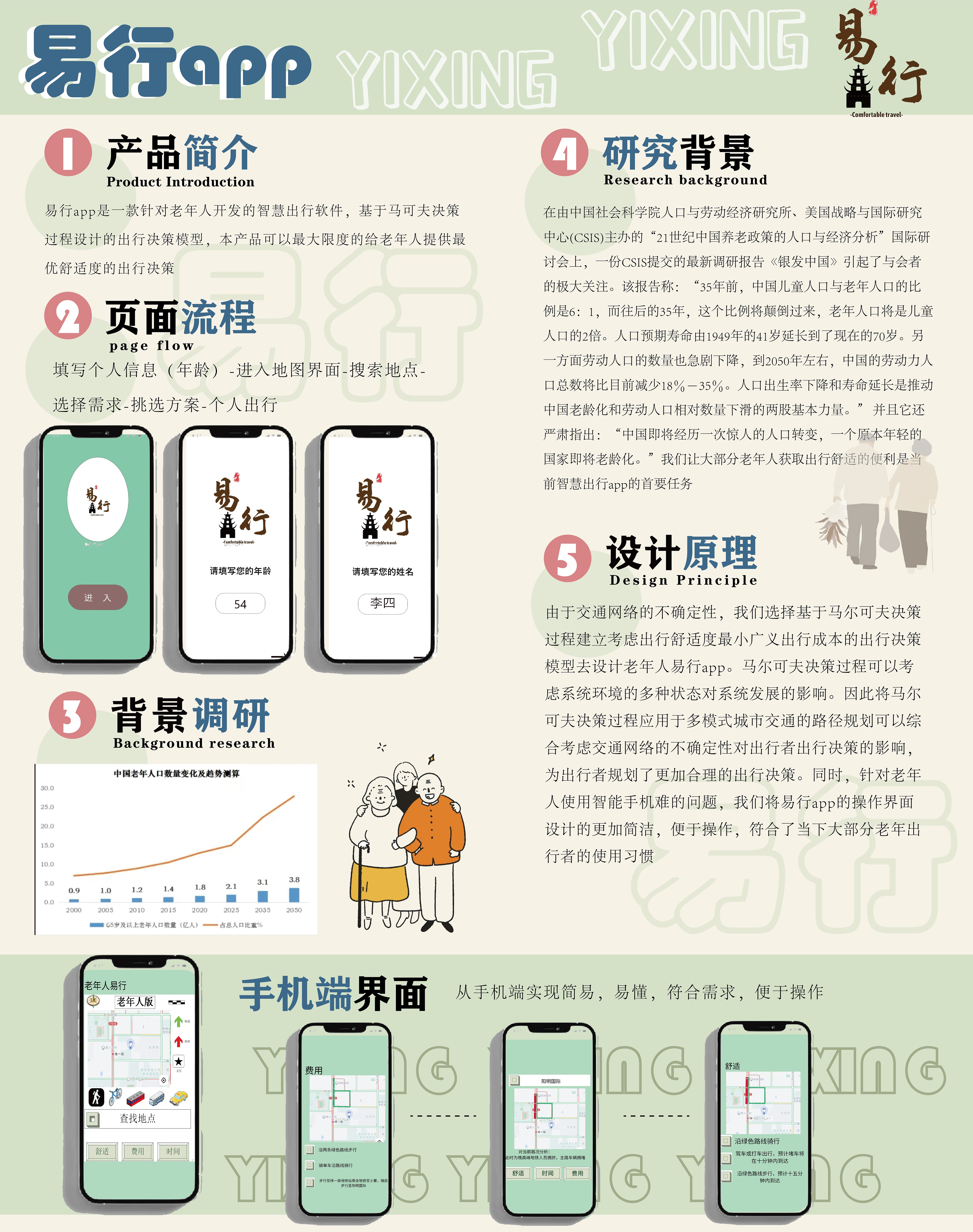 由于交通网络的不确定性,我们选择基于马尔可夫决策过程建立考虑出行舒适度最小广义出行成本的出行决策模型去设计老年人易行app。马尔可夫决策过程可以考虑系统环境的多种状态对系统发展的影响。因此将马尔可夫决策过程应用于多模式城市交通的路径规划可以综合考虑交通网络的不确定性对出行者出行决策的影响,为出行者规划了更加合理的出行决策。我们将易行app的操作界面设计的更加简洁,便于老年人使用。