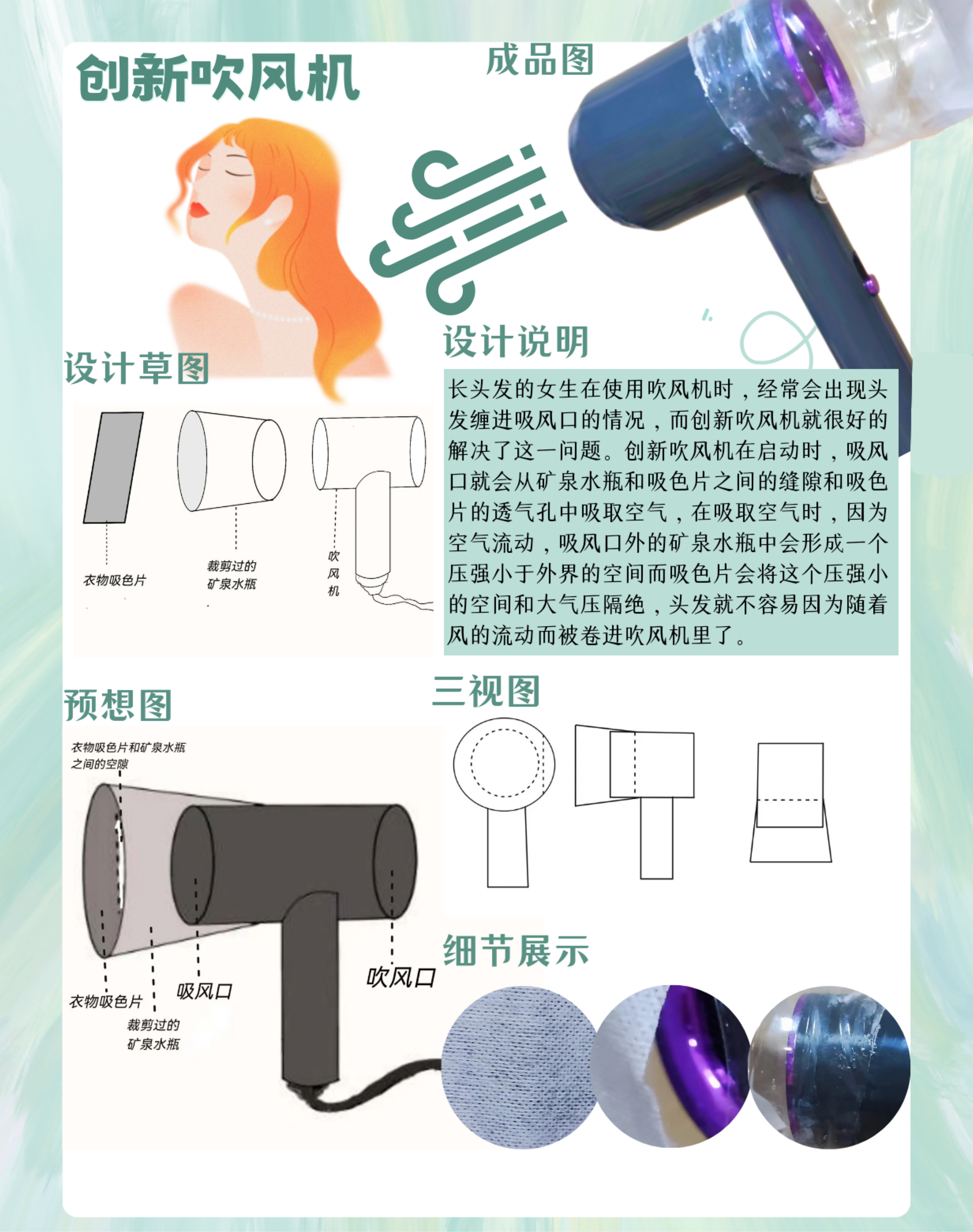 设计灵感来自于吹头发的时候,头发容易被卷进吹风机里,而创新吹风机就很好的解决了这一问题。创新吹风机在启动时,吸风口就会从矿泉水瓶和吸色片之间的缝隙和吸色片的透气孔中吸取空气,在吸取空气时,因为空气流动,吸风口外的矿泉水瓶中会形成一个压强小于外界大气压强的空间而吸色片会将这个压强小的空间和大气压隔绝,头发就不容易因为随着风的流动而被卷进吹风机里了。