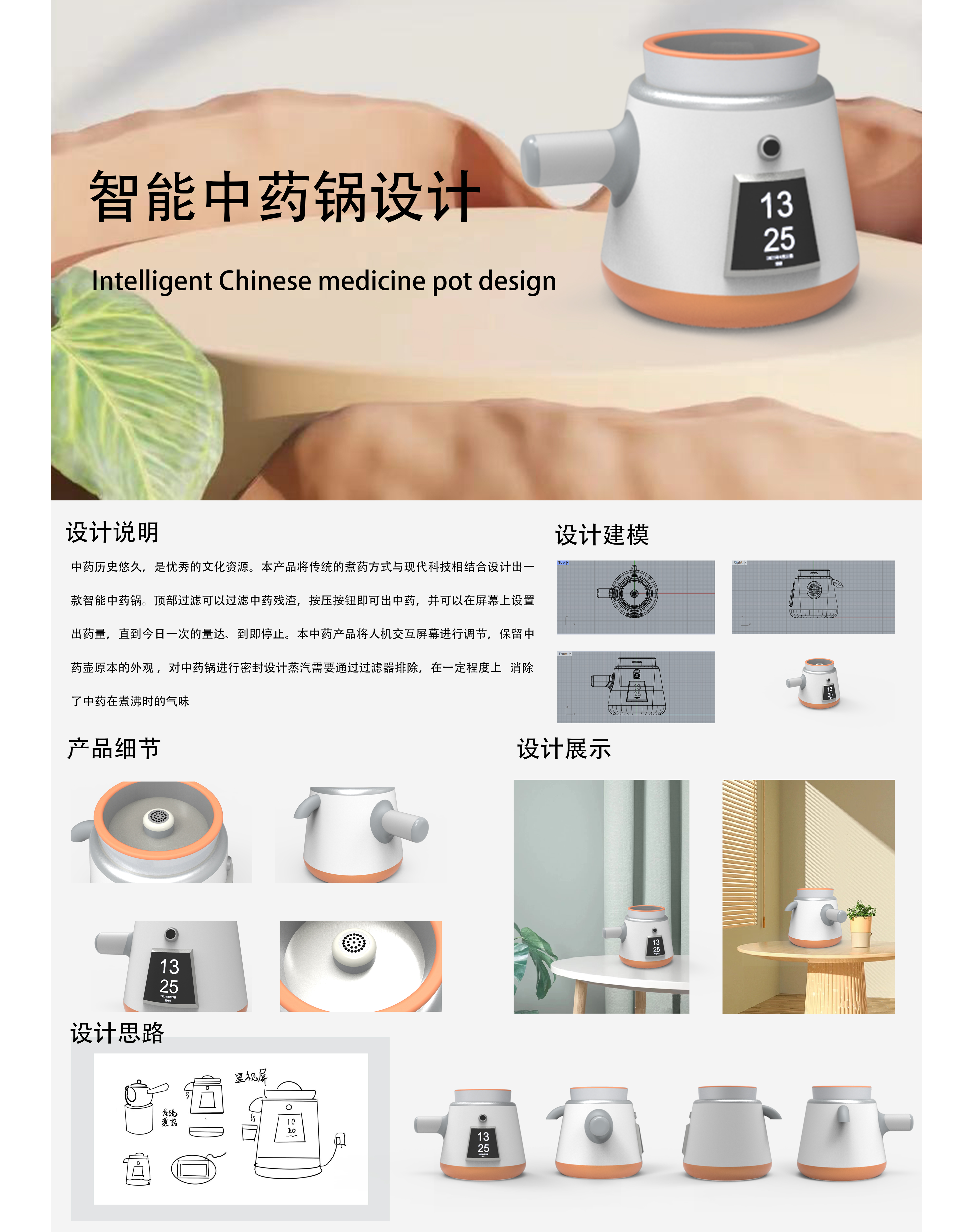 中药历史悠久,是优秀的文化资源。本产品将传统的煮药方式与现代科技相结合设计出一款智能中药锅。顶部过滤可以过滤中药残渣,按压按钮即可出中药,并可以在屏幕上设置出药量,直到今日一次的量达、到即停止。本中药产品将人机交互屏幕进行调节,保留中药壶原本的外观,对中药锅进行密封设计蒸汽需要通过过滤器排除,在一定程度上消除了中药在煮沸时的气味。