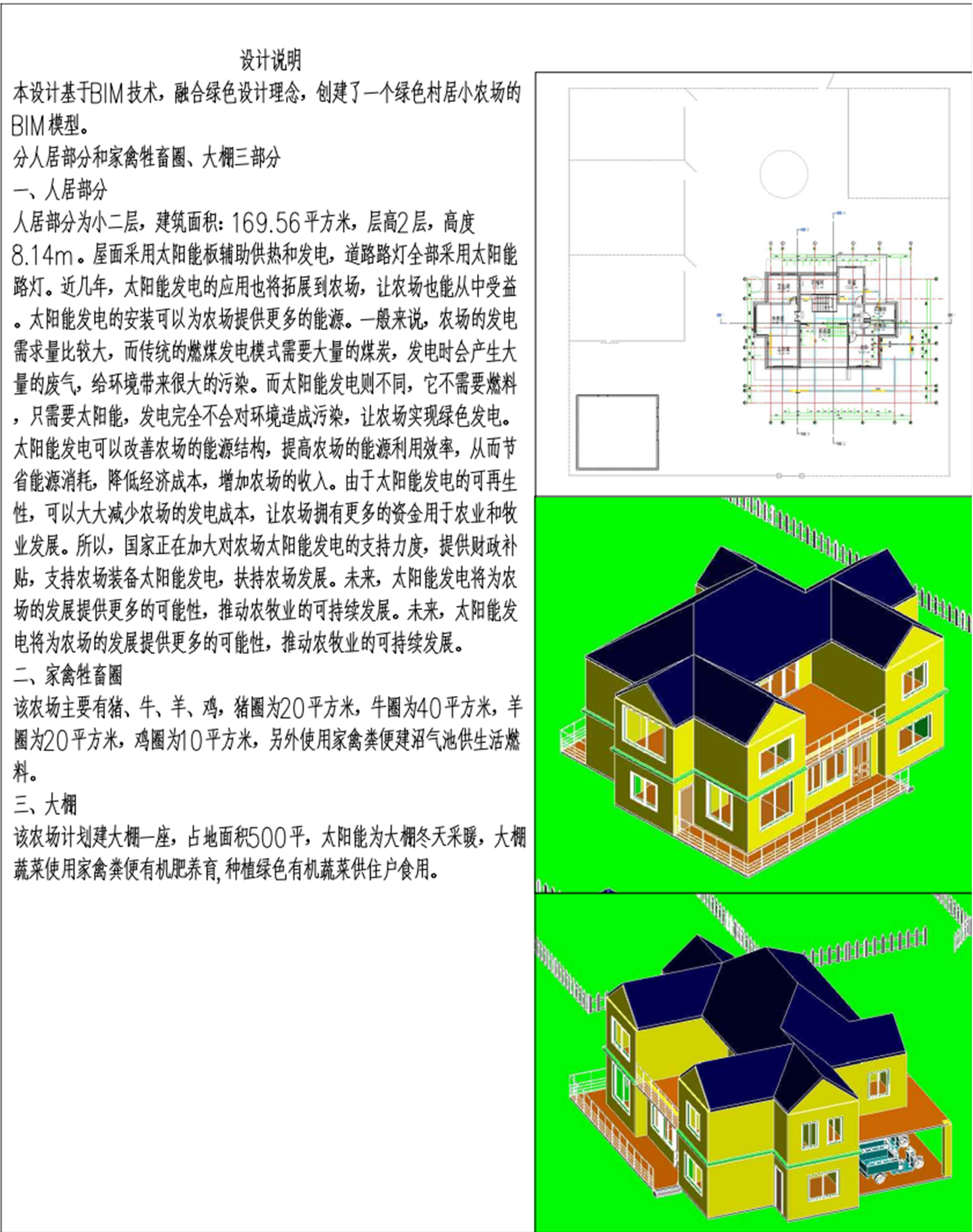 本设计基于BIM技术,融合绿色设计理念,创建了一个绿色村居小农场的BIM模型。分人居部分和家禽牲畜圈、大棚三部分人居部分 人居部分为小二层,建筑面积:169.56㎡,层高2层,高度8.14m。家禽牲畜圈该农场主要有猪、牛、羊、鸡。该农场计划建大棚一座,占地面积500㎡,