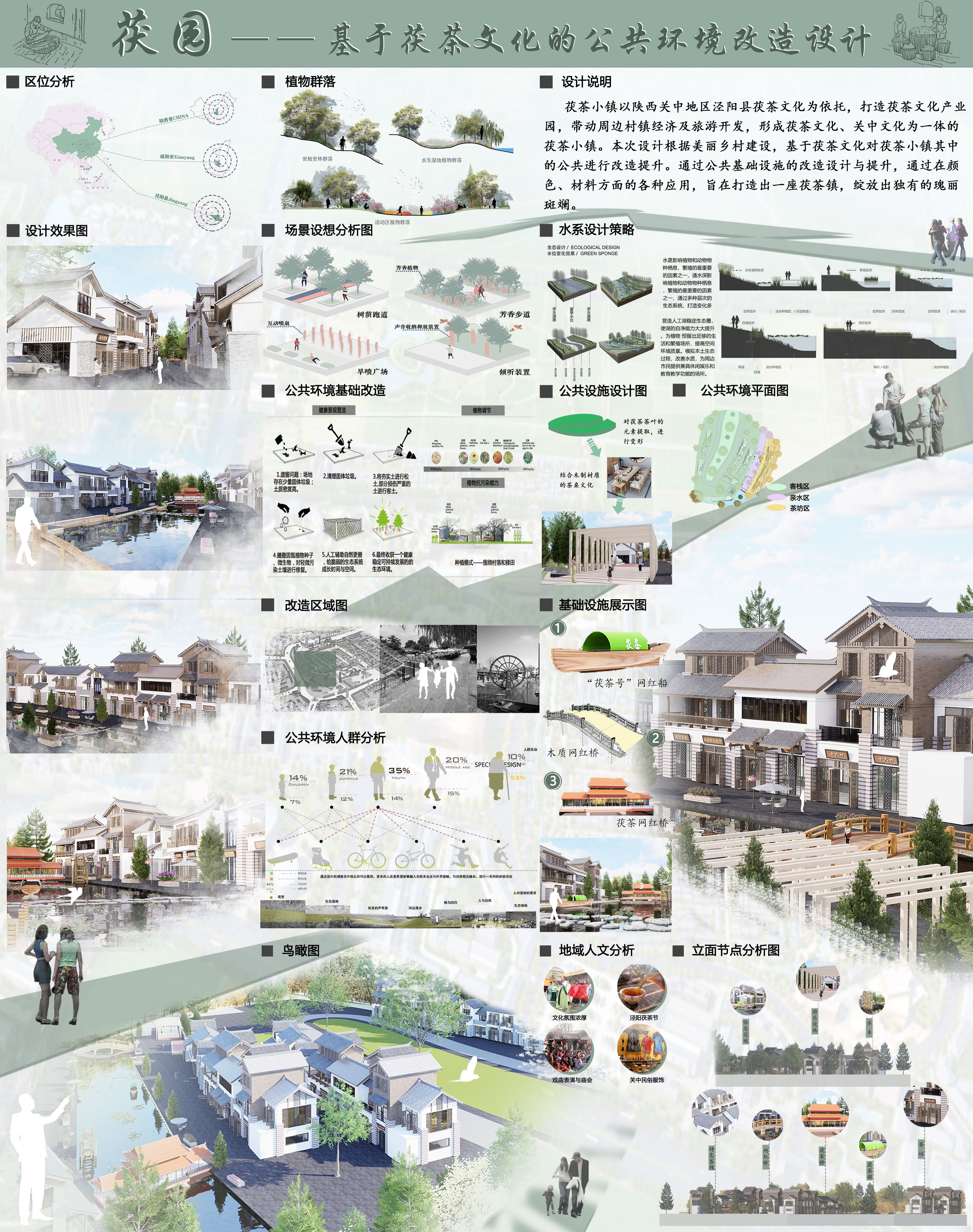 茯茶小镇以陕西关中地区泾阳县茯茶文化为依托,打造茯茶文化产业园,带动周边村镇经济及旅游开发,形成茯茶文化、关中文化为一体的茯茶小镇。本次设计根据美丽乡村建设,基于茯茶文化对茯茶小镇其中的公共进行改造提升。通过公共基础设施的改造设计与提升,通过在颜色、材料方面的各种应用,旨在打造出一座茯茶镇,绽放出独有的瑰丽斑斓。