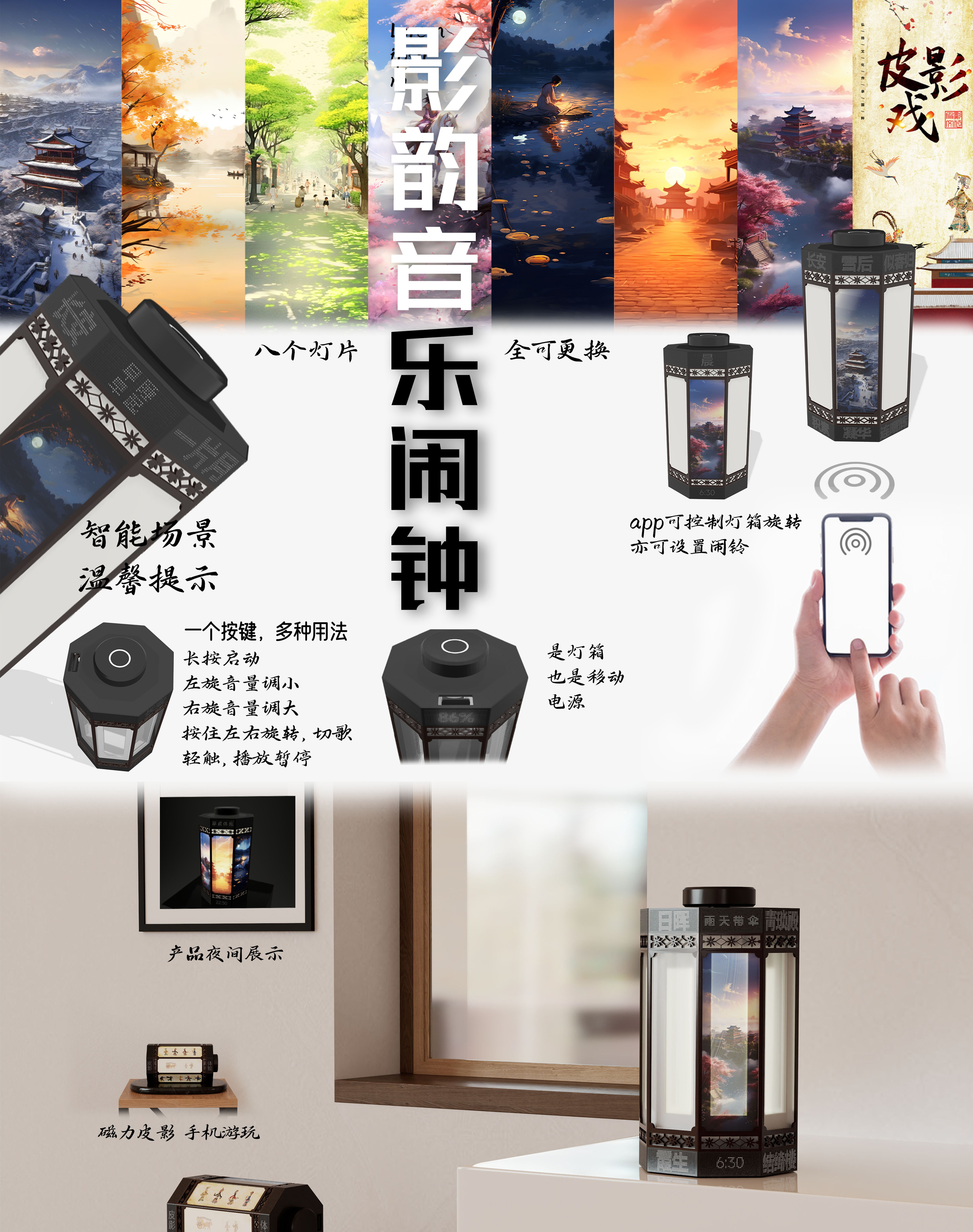 利用皮影和走马灯的原理,进行再创新,将其原理融入到智能音箱与其闹钟的功能之中。时间与场景的变化会使其显示不同的幻灯片,也可以选择全部点亮。利用音响的孔洞巧妙的结合了文字显示的功能,星星点点的光亮形成一个个字句,来实现视觉交互,也可显示电量。巧妙解决了当下智能音箱视觉交互问题,并且可以结合时间、场景、天气与灯片进行联动提示,是充电宝,可显示电量。在横置音乐闹钟时,手机可远程控制进行皮影游玩。