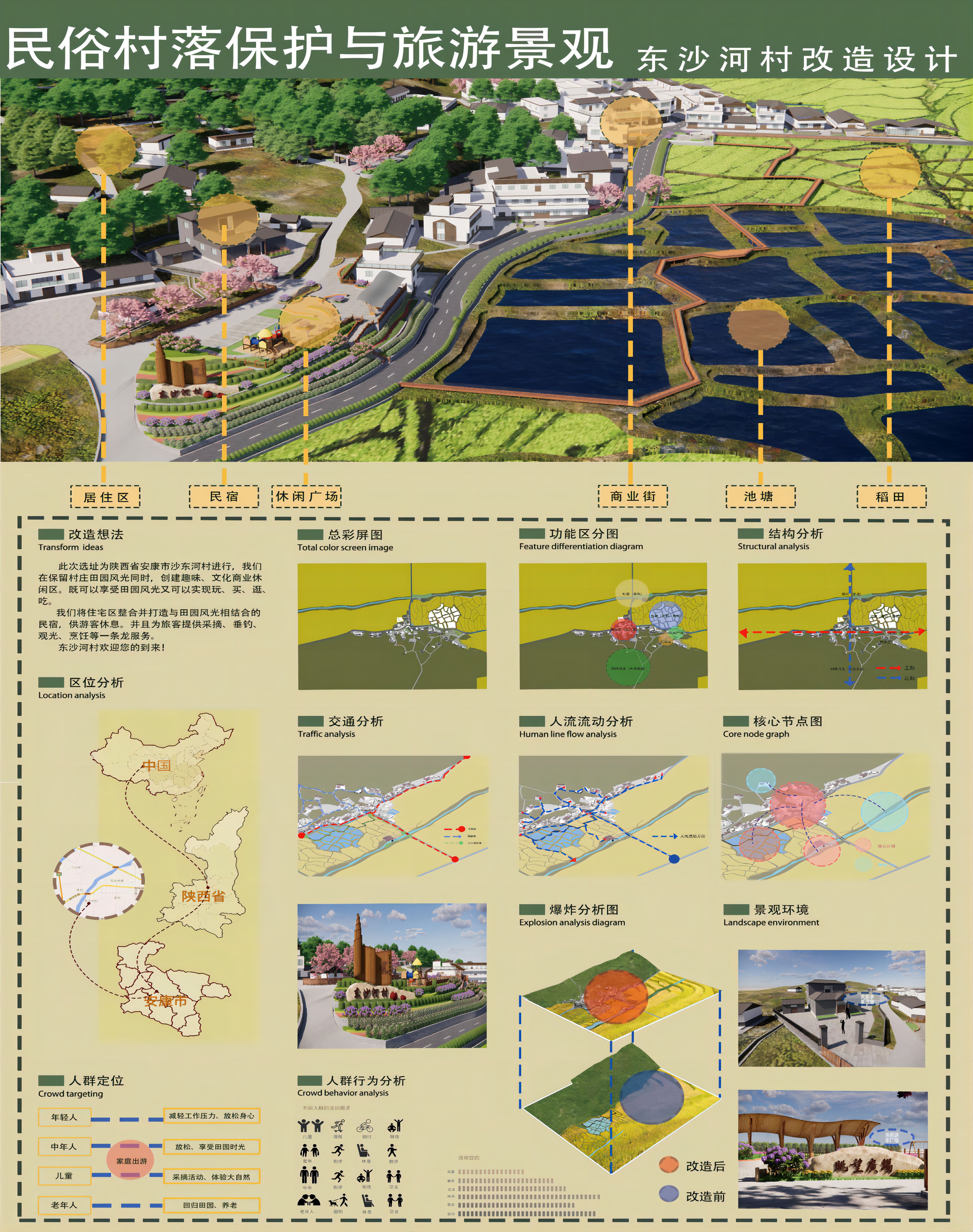 该作品选址为陕西省安康市沙东河村进行,我们在保留村庄田园风光同时,创建趣味、文化商业休闲区。既可以享受田园风光又可以实现玩、买、逛、吃。我们将住宅区整合并打造与田园风光相结合的民宿,供游客休息。并且为旅客提供采摘、垂钓、观光、烹饪等一条龙服务。