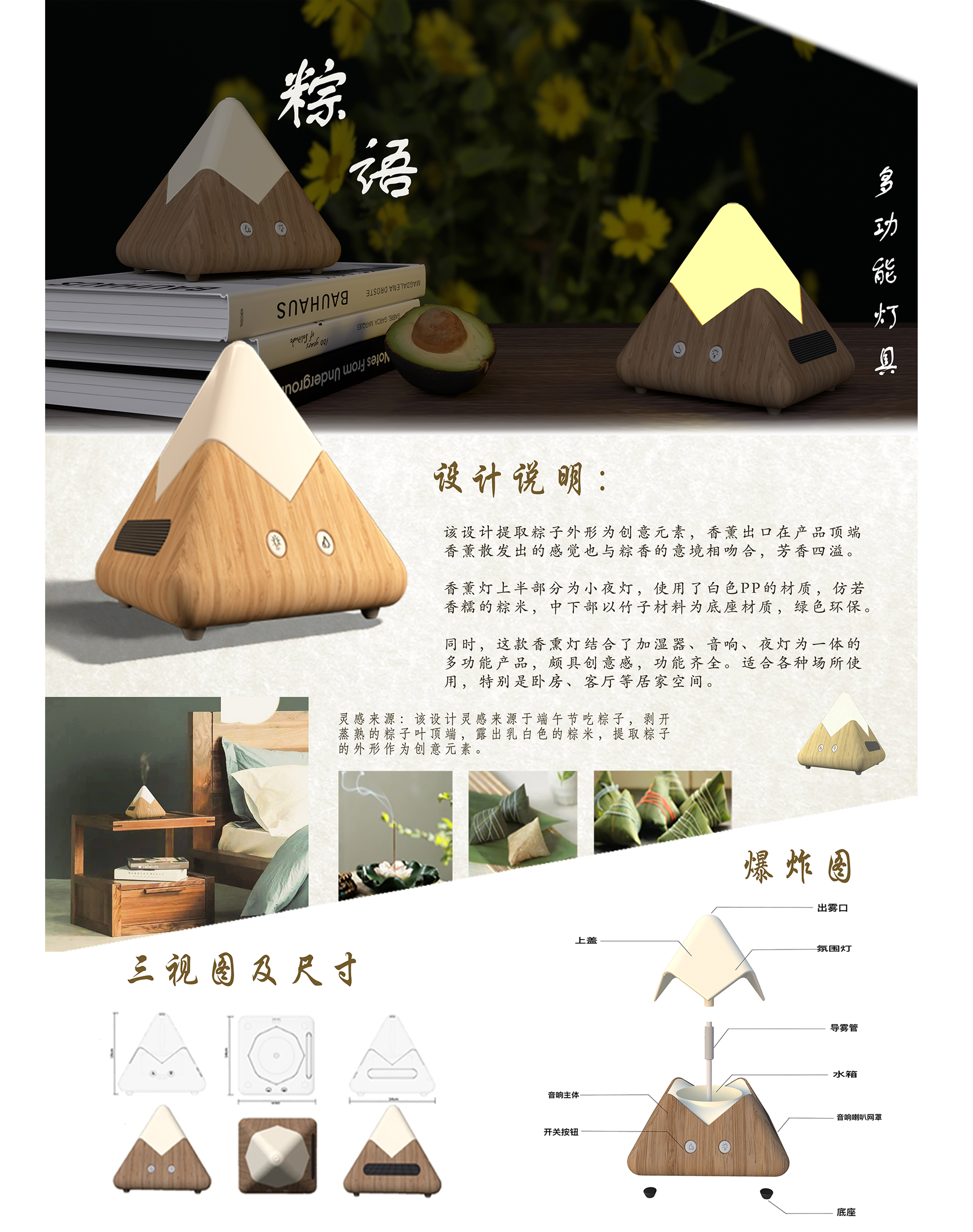 该设计提取粽子外形为创意元素,香薰出口在产品顶端,香薰散发出的感觉也与棕香的意境相吻合,芳香四溢。香薰灯上半部分为小夜灯,使用了白色PP的材质,仿若香糯的棕米,中下部以竹子材料为底座材质,绿色环保。同时,这款香熏灯结合了加湿器、音响、夜灯为一体的多功能产品烦具创意感功能齐全。适合各种场所使用,特别是卧房、客厅等居家空间