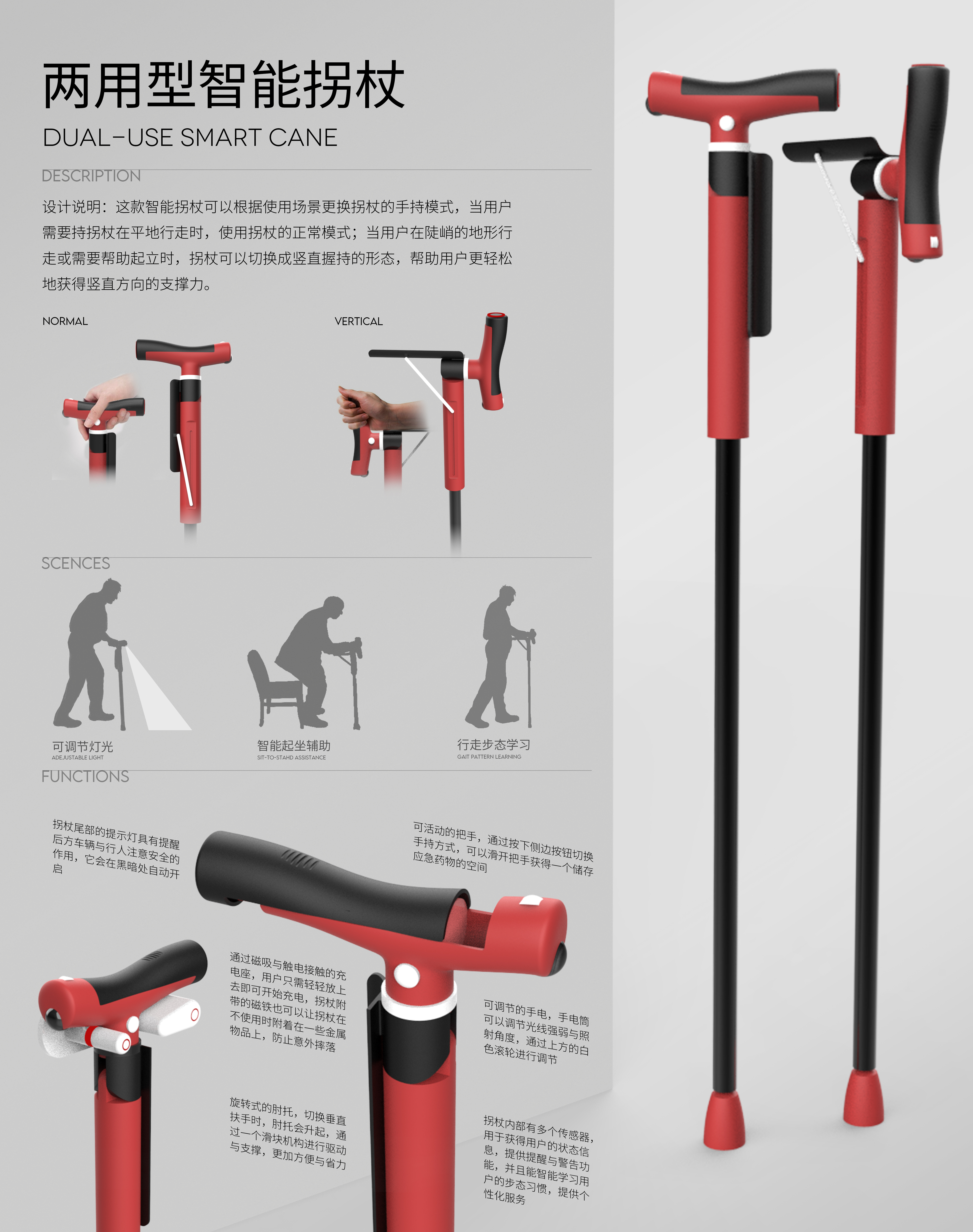 这款智能拐杖可以根据使用场景更换拐杖的手持模式,当用户需要持拐杖在平地行走时,使用拐杖的正常模式;当用户在陡峭的地形行走或需要帮助起立时,拐杖可以切换成竖直握持的形态,帮助用户更轻松地获得竖直方向的支撑力。此外,它还包含一个可以轻易打开的应急药盒,可调节角度的智能手电筒,一个配套的便捷充电座。