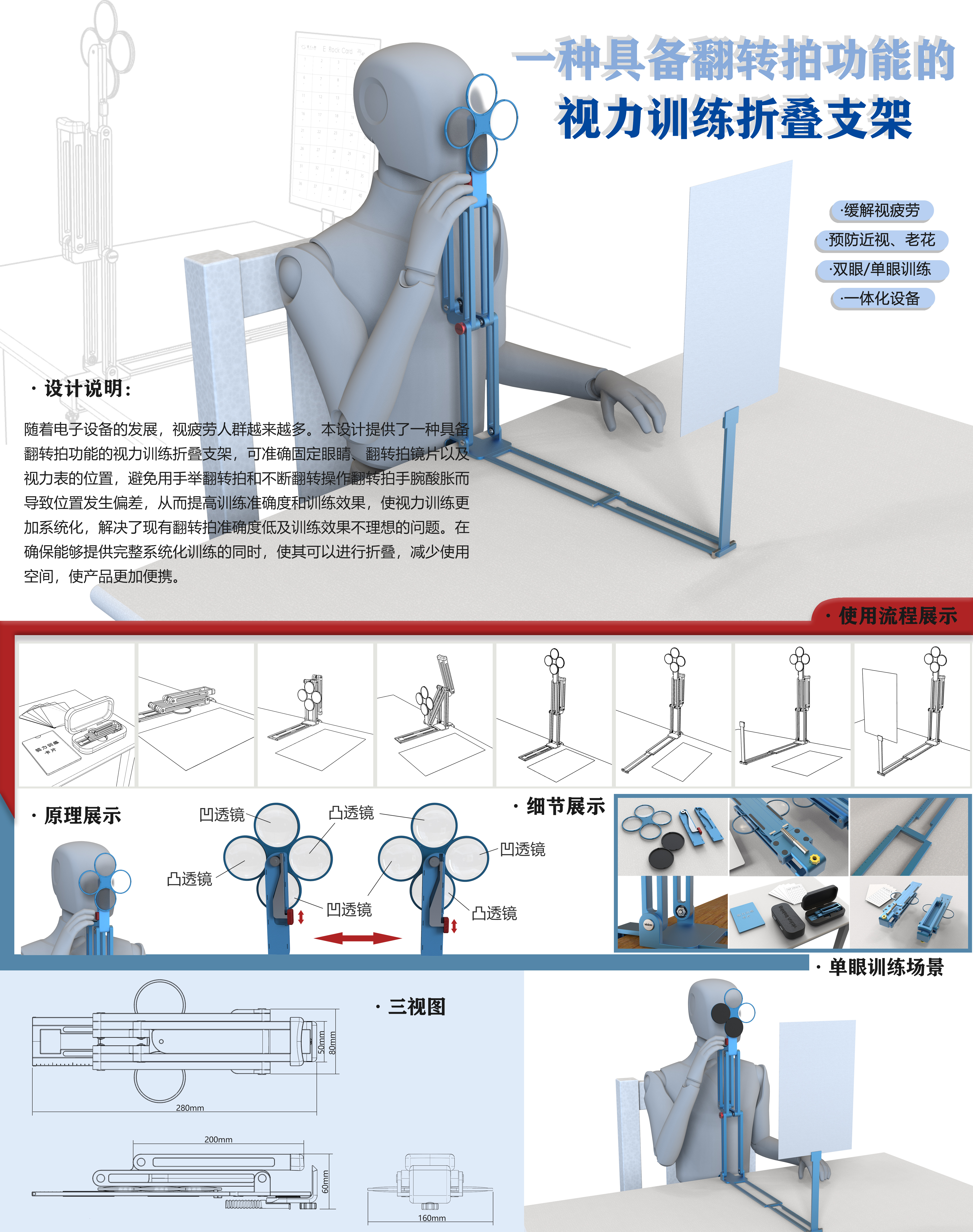 随着电子设备的发展,视疲劳人群越来越多。本设计提供了一种具备翻转拍功能的视力训练折叠支架,可准确固定眼睛、翻转拍镜片以及视力表的位置,避免用手举翻转拍和不断翻转操作翻转拍手腕酸胀而导致位置发生偏差,从而提高训练准确度和训练效果,使视力训练更加系统化,解决了现有翻转拍准确度低及训练效果不理想的问题。在确保能够提供完整系统化训练的同时,使其可以进行折叠,减少使用空间,使产品更加便携。