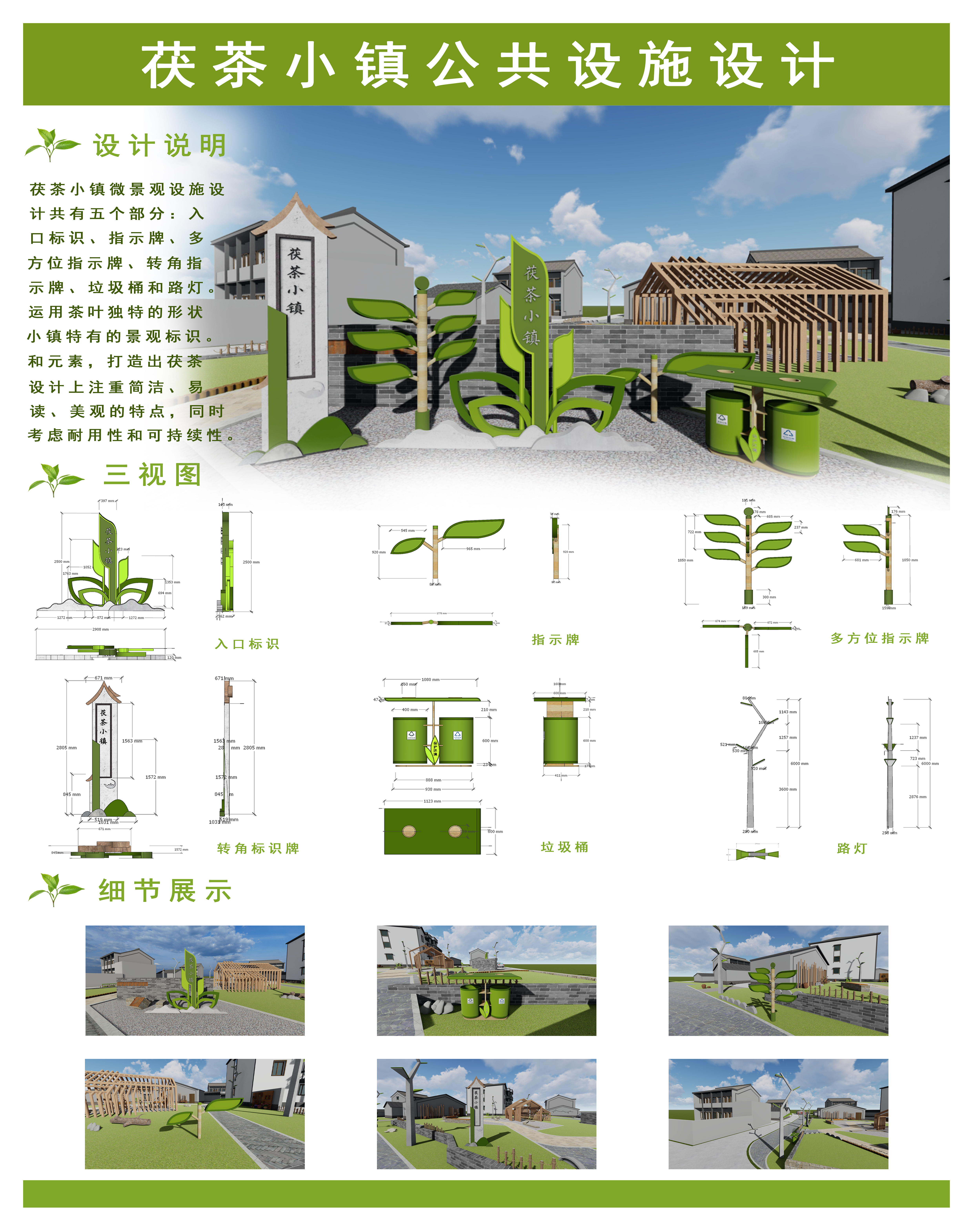 茯茶小镇微景观设施设计共有五个部分:入口标识、指示牌、多方位指示牌、转角指示牌、垃圾桶和路灯运用茶叶独特的形状小镇特有的景观标识和元素,打造出获茶设计上注重简洁、易读、美观的特点,同时考虑耐用性和可持续性。