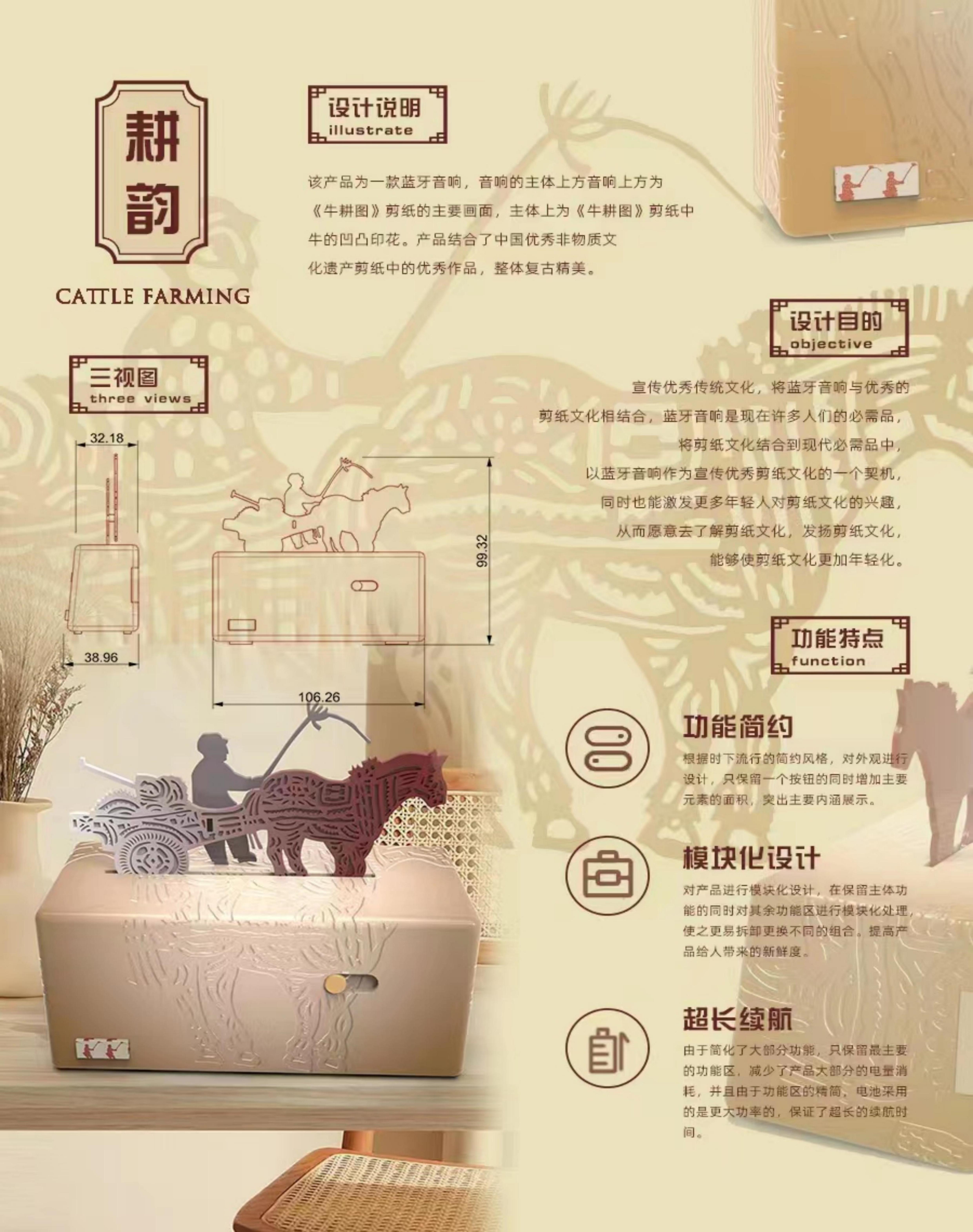 该产品为一款蓝牙音响,音响的主体上方音响上方为《牛耕图》剪纸的主要画面,主体上为《牛耕图》剪纸中牛的凹凸印花。产品结合了中国优秀非物质文化遗产剪纸中的优秀作品,整体复古精美。将蓝牙音响与优秀的剪纸文化相结合,蓝牙音响是现在许多人们的必需品,将剪纸文化结合到现代必需品中,以蓝牙音响作为宣传优秀剪纸文化的一个契机,同时也能激发更多年轻人对剪纸文化的兴趣,从而愿意去了解剪纸文化,使剪纸文化更加年轻化。