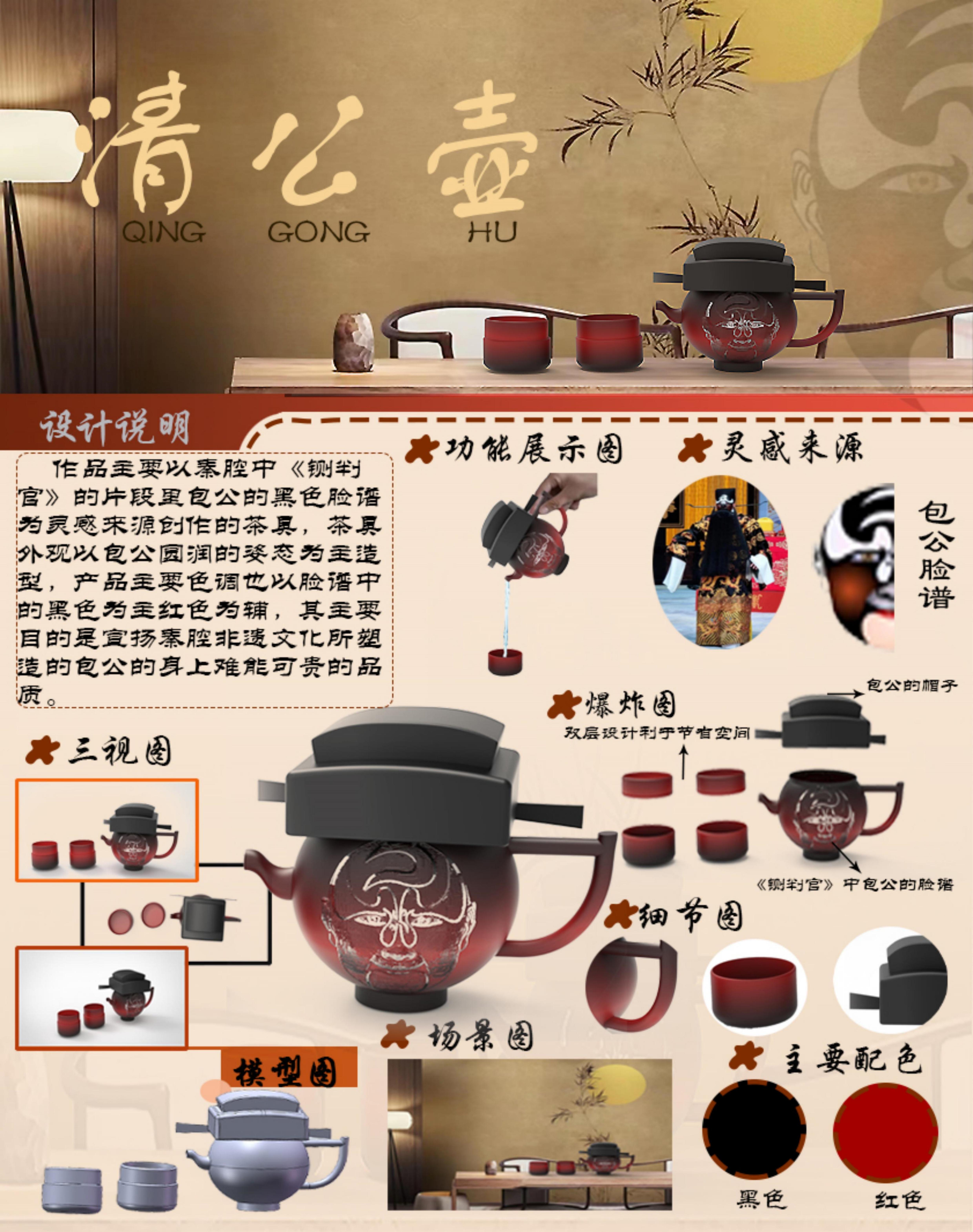 设计说明 作品主要以秦腔中《铡判官》的片段里包公的黑色脸谱为灵感来源创作的茶具,茶具外观以包公圆润的姿态为主造型,产品主要色调也以脸谱中的黑色为主红色为辅,其主要目的是宣扬秦腔非遗文化所塑造的包公的身上难能可贵的品质。