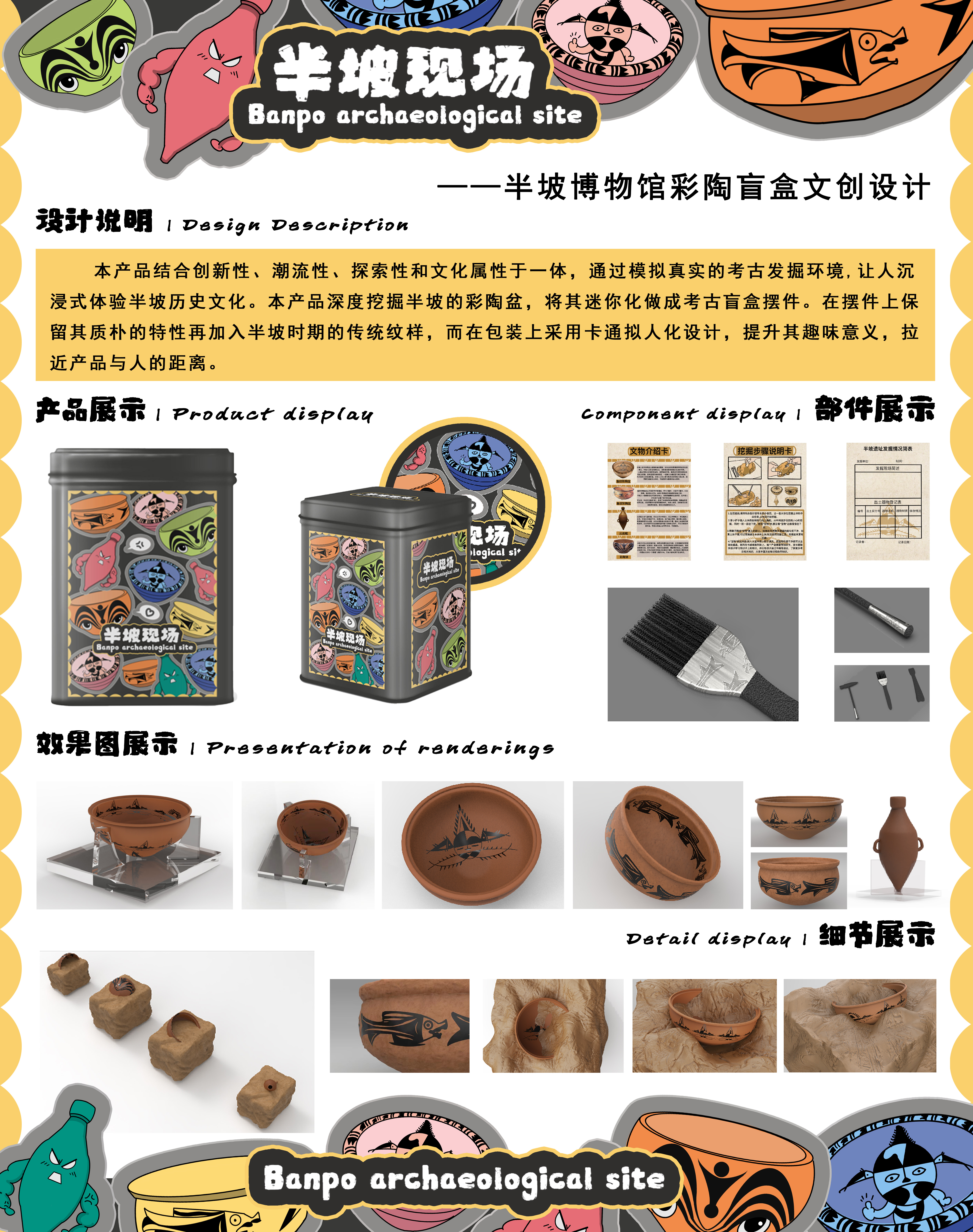 本产品结合创新性、潮流性、探索性和文化属性于一体,通过模拟真实的考古发掘环境,让人沉浸式体验半坡历史文化。本产品深度挖掘半坡的彩陶盆,将其迷你化做成考古盲盒摆件。在摆件上保留其质朴的特性再加入半坡时期的传统纹样,而在包装上采用卡通拟人化设计,提升其趣味意义,拉近产品与人的距离。