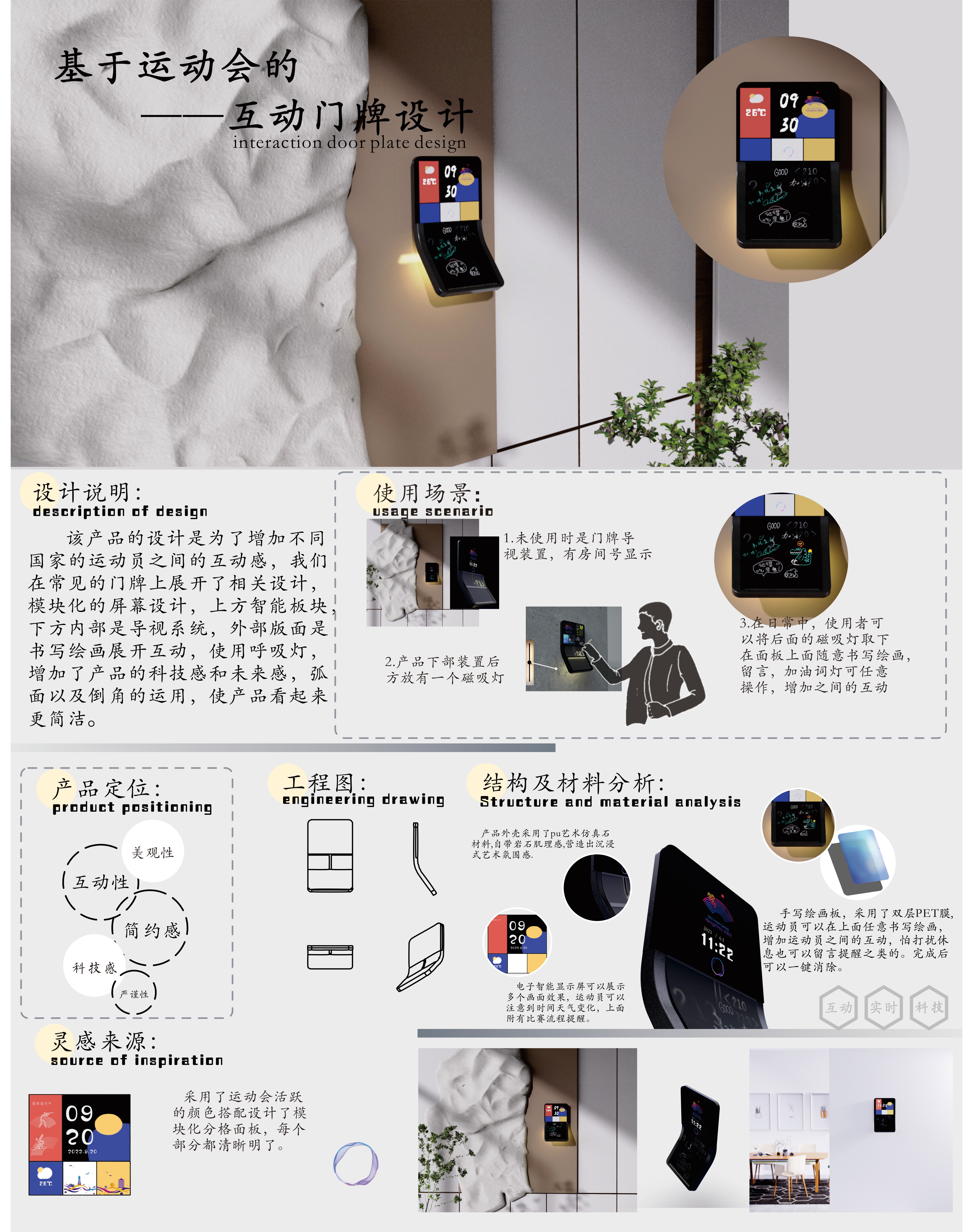 该产品的设计是为了增加不同国家的运动员之间的互动感,我们在常见的门牌上展开了相关设计,模块化的屏幕设计,上方智能板块,下方内部是导视系统,外部版面是书写绘画展开互动,使用呼吸灯,增加了产品的科技感和未来感,弧面以及倒角的运用,使产品看起来更简洁。