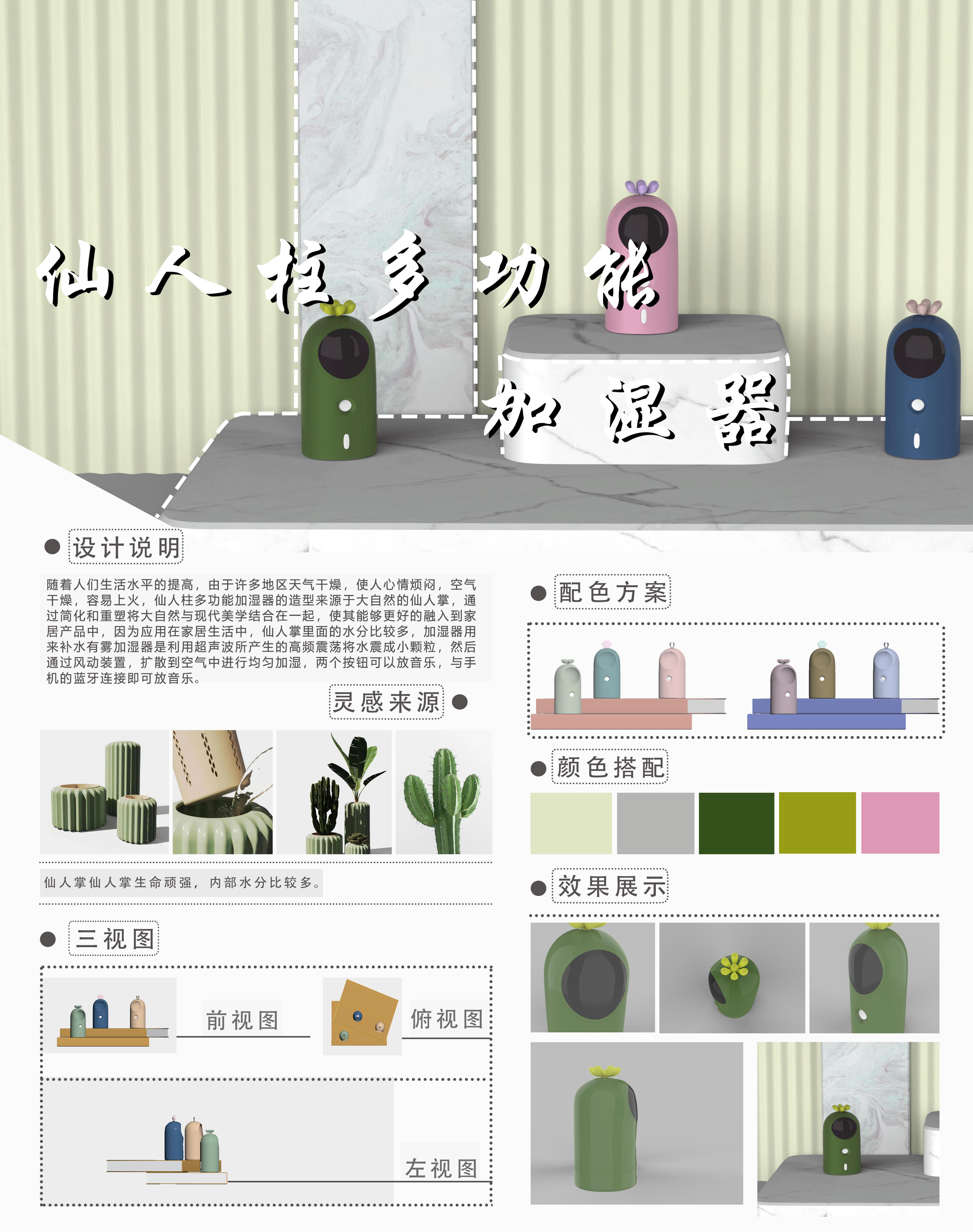 设计说明 随着人们生活水平的提高,由于许多地区天气干燥,使人心情烦闷,空气干燥,容易上火,仙人柱多功能加湿器的造型来源于大自然的仙人掌,通过简化和重塑将大自然与现代美学结合在一起,使其能够更好的融入到家居产品中,因为应用在家居生活中,,加湿器用来补水有雾加湿器是利用超声波所产生的高频震荡将水震成小颗粒,然后通过风动装置,扩散到空气中进行均匀加湿,两个按钮可以放音乐,与手机的蓝牙连接即可放