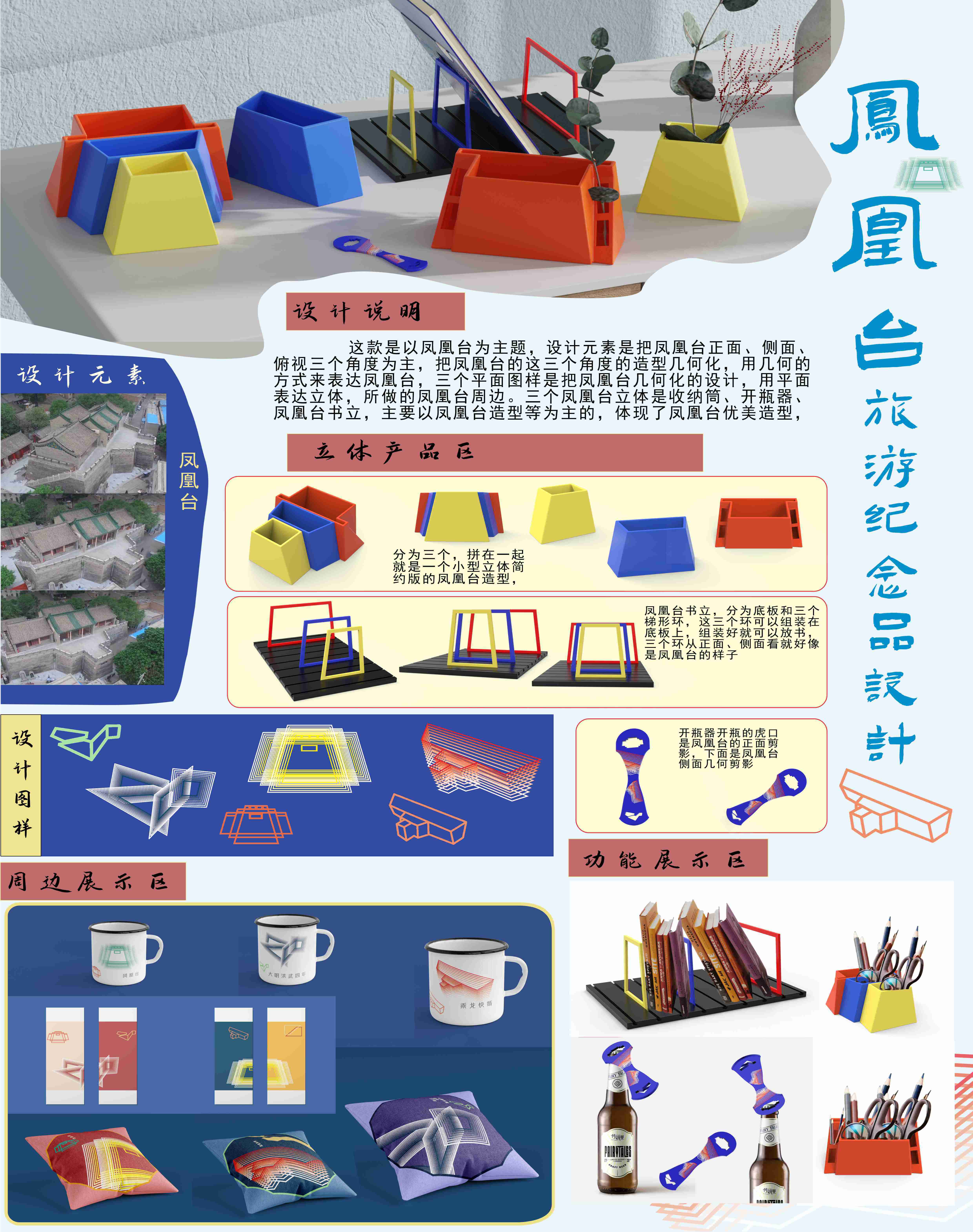 这款是以凤凰台为主题,设计元素是把凤凰台正面、侧面、俯视三个角度为主,把凤凰台的这三个角度的造型几何化,用几何的方式来表达凤凰台,三个平面图样是把凤凰台几何化的设计,用平面表达立体,所做的凤凰台周边。三个凤凰台立体是收纳筒、开瓶器、凤凰台书立,主要以凤凰台造型等为主的,体现了凤凰台优美造型,将凤凰台的形象融入生活。