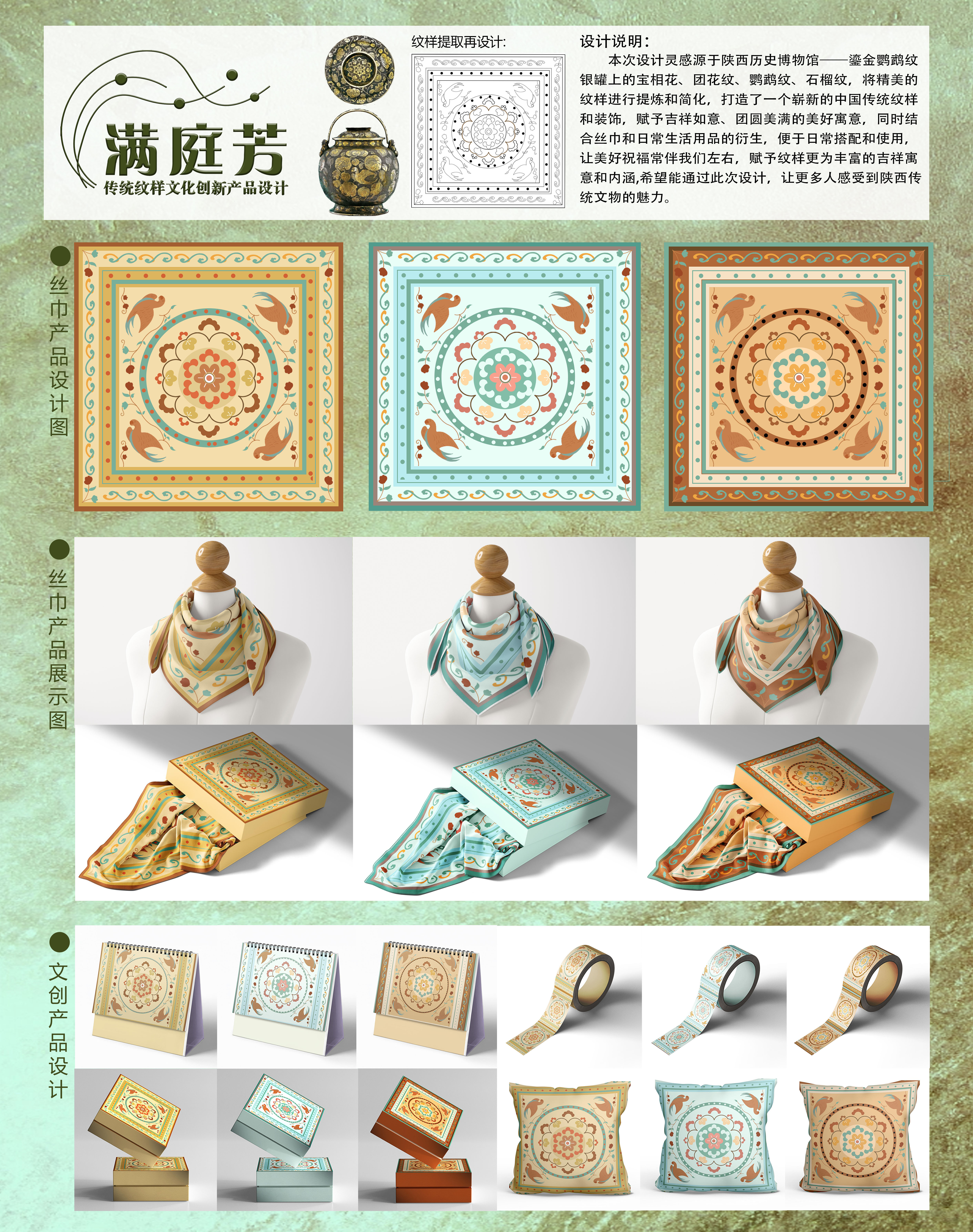 本次设计灵感源于陕西历史博物馆——鎏金鹦鹉纹银罐上的宝相花、团花纹、鹦鹉纹、石榴纹,将精美的纹样进行提炼和简化,打造了一个崭新的中国传统纹样和装饰,赋予吉祥如意、团圆美满的美好寓意,同时结合丝巾和日常生活用品的衍生,便于日常搭配和使用,让美好祝福常伴我们左右,赋予纹样更为丰富的吉祥寓意和内涵,希望能通过此次设计,让更多人感受到陕西传统文物的魅力。