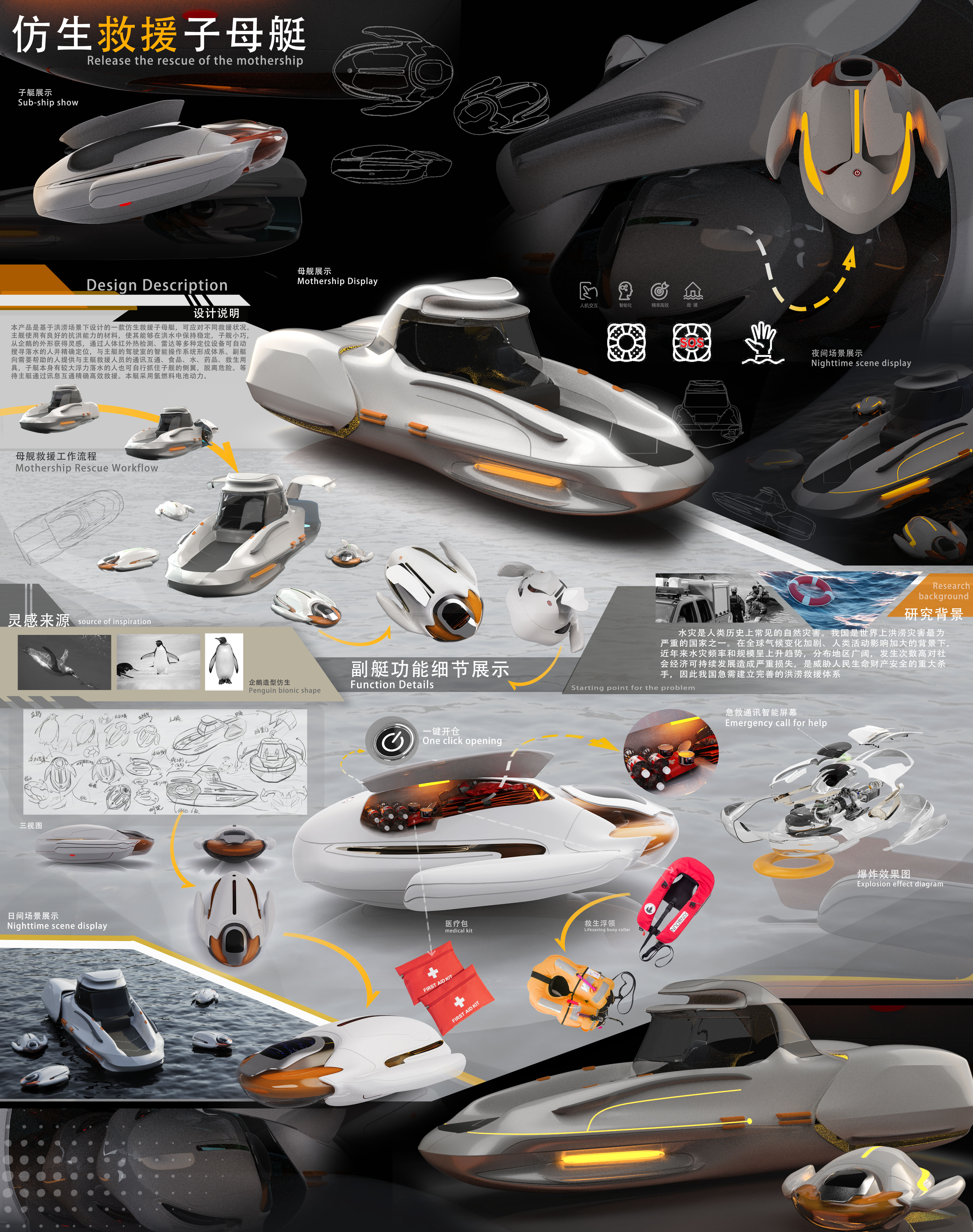本产品是基于洪涝场景下设计的一款仿生救援子母艇,可应对不同救援状况。主舰使用有抗洪能力的材料,使其能够在洪水中保持稳定,子舰小巧,从企鹅的外形获得灵感,通过人体红外热检测、雷达等多种定位设备可自动搜寻落水的人并精确定位,与主艇的驾驶室的智能操作系统形成体系。副艇向需要帮助的人提供与主艇救援人员的通讯互通、食品、水、药品、救生用具等待主艇通过讯息互通精确高效救援。本艇采用氢燃料电池动力。